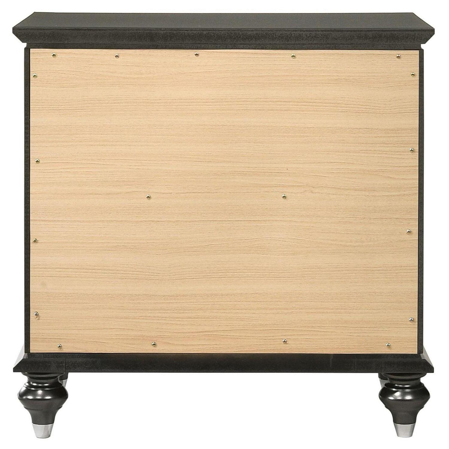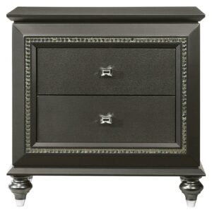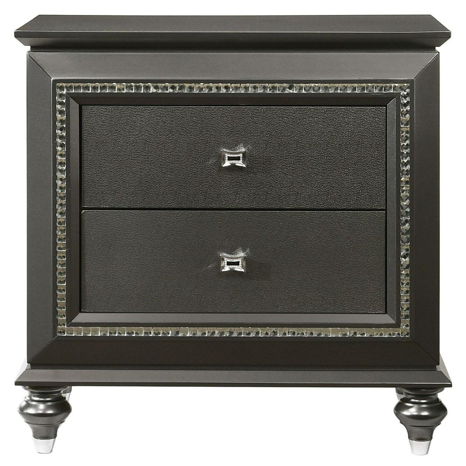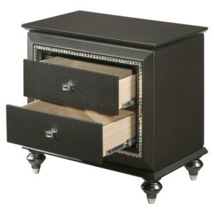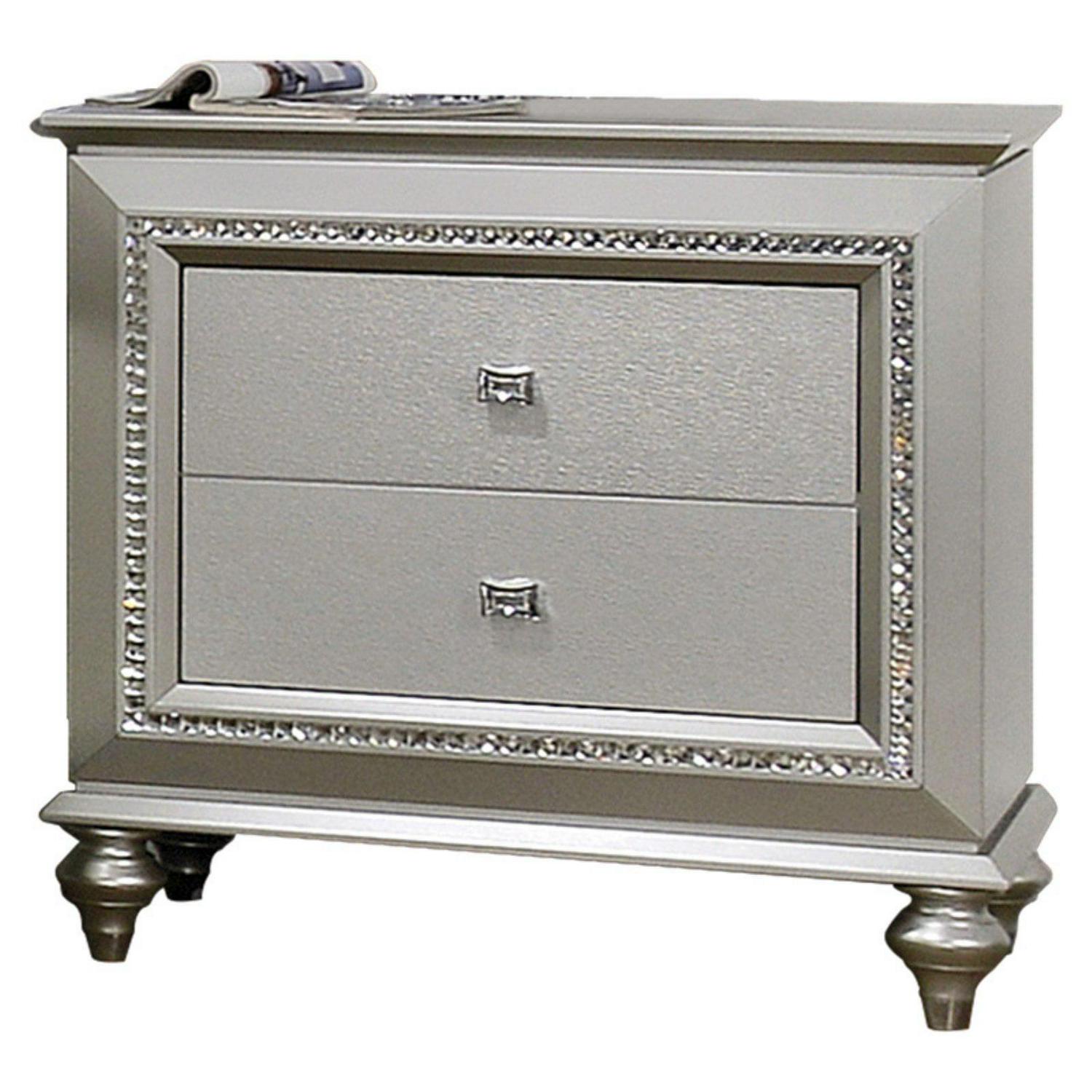Trimmed with sparkling rhinestones, the Acme Furniture Kaitlyn 2 Drawer Nightstand is sure to add glamour to your bedroom décor. The solid and engineered wood nightstand features an elegant choice of finish and flaunts sophisticated details like a molded top and urn feet. Two drawers slide effortlessly on metal glides, giving you a place to store essentials within easy reach of your bed.