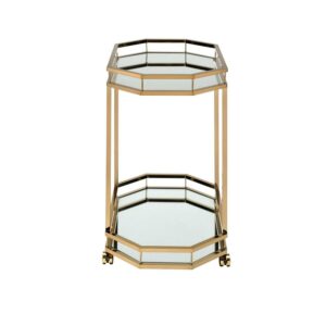 Metal Serving Cart, Mirror & gold- Saltoro Sherpi Show off your personality with this serving cart, featuring a metal frame finished in gold and mirrored shelves for that glam appeal. The two mirror shelves are the ideal place for placing your dishes and dining accessories. Roll it where need be on its softer rubber wheels and prepare to entertain.