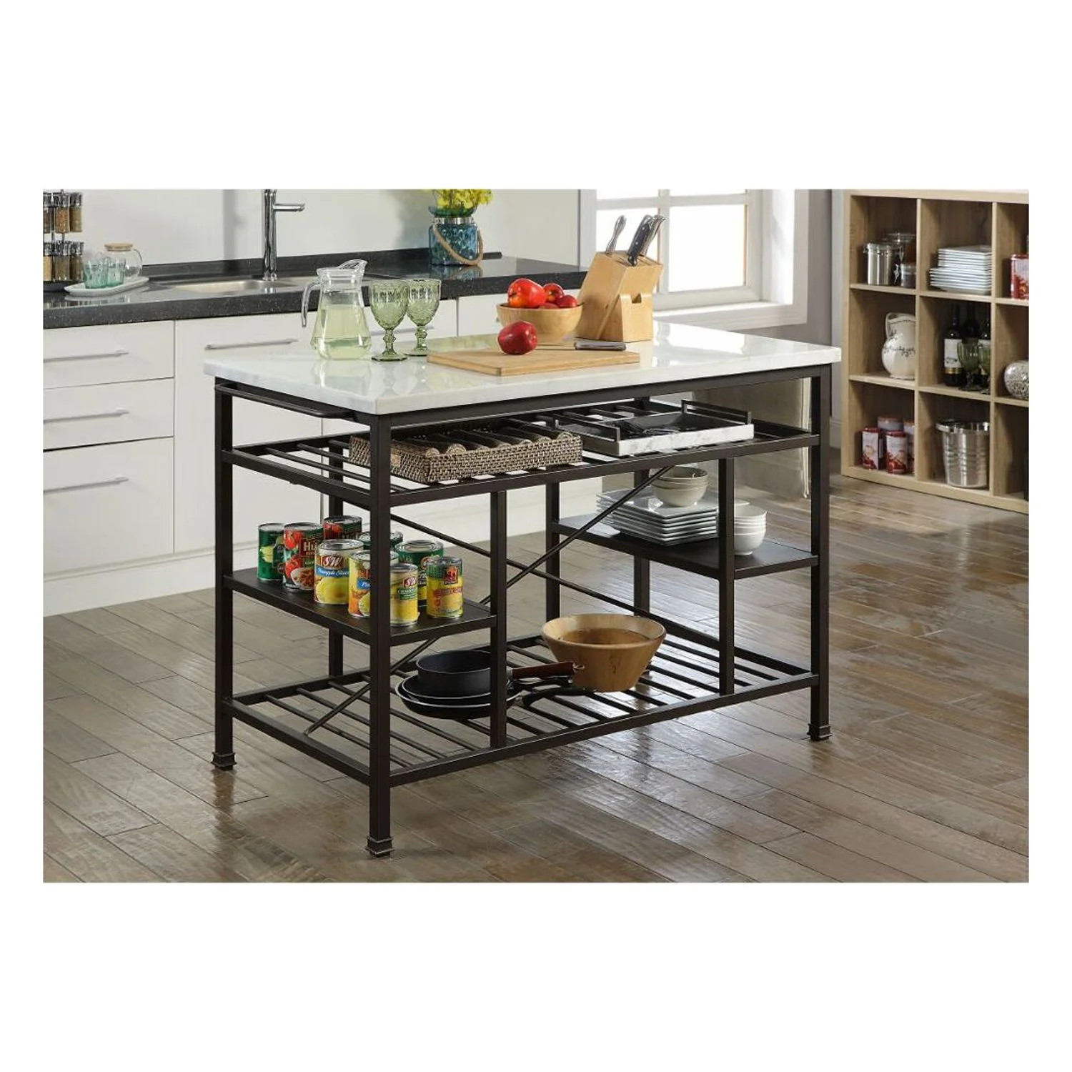 Dimensions: 50W x 28D x 36H Marble and gunmetal Metal Frame Rectangular Kitchen Island Storage: Towel Rack, 4 Open Compartments