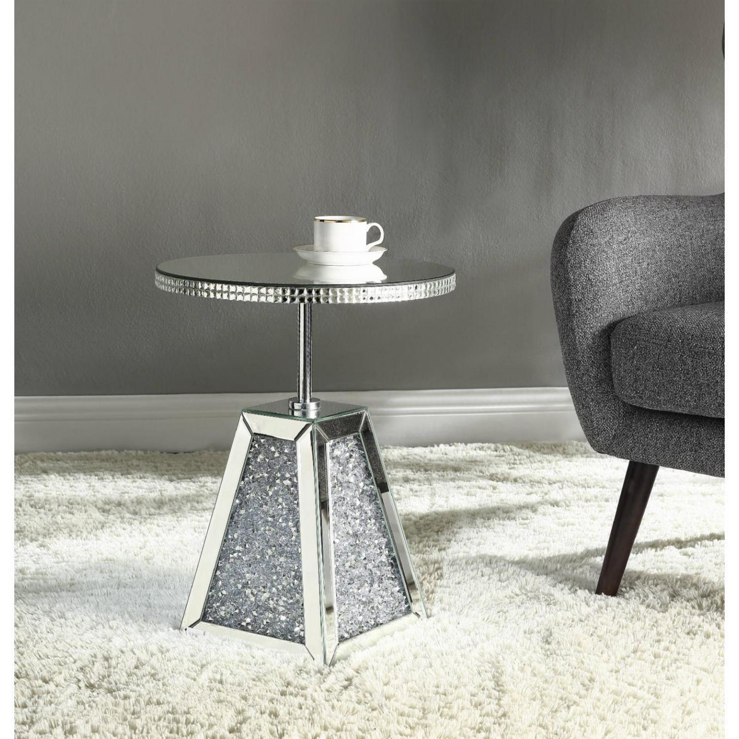 The Noralie occasional table is perfect for your modern grace home. This mirrored faux diamond pedestal features an elegant twist base. Place a lamp or plant on the rounded surface. Use in any room to enhance your décor.