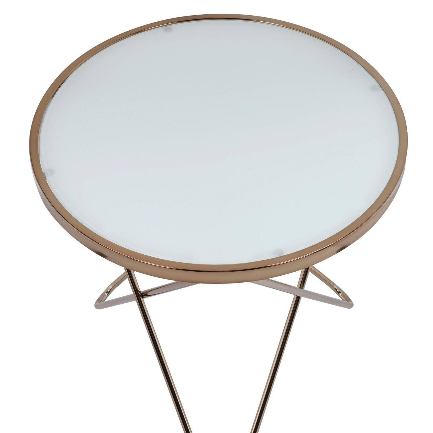 Contemporary Style Round Glass and Metal Coffee Table, White and Gold- Saltoro Sherpi This contemporary style coffee table is made with superior quality glass that gives immense durability. It is designed to provide elegance and creates memories for the user over a cup of coffee. The metal legs are strongly built for a perfect grounding of the product. The champagne and white finish is the main attraction of the product.