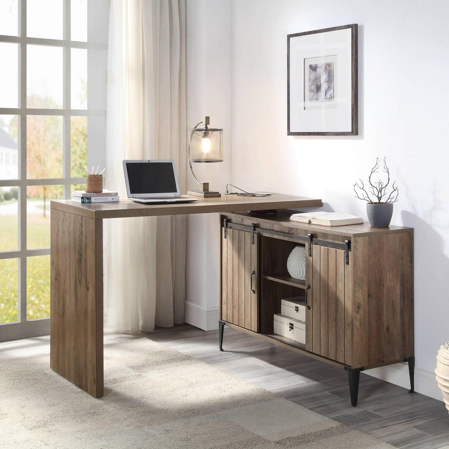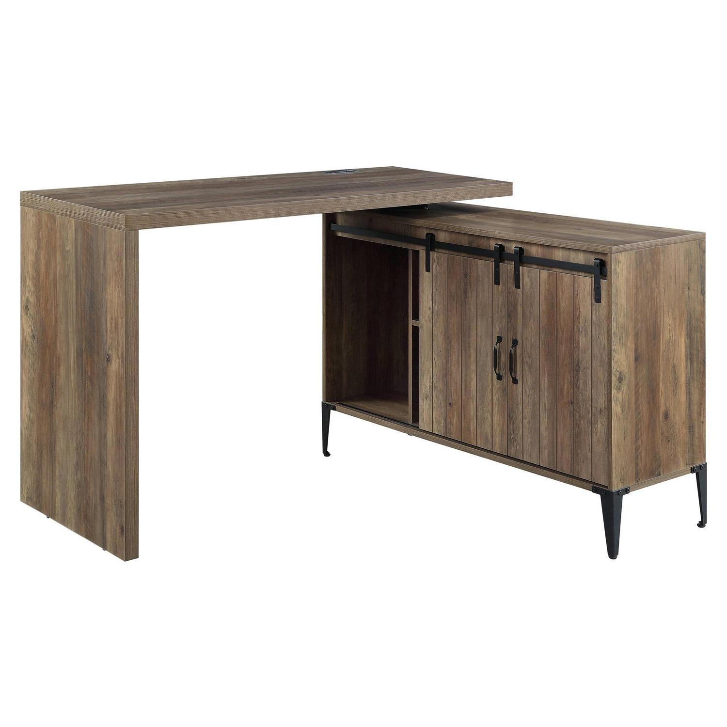 Create a dreamy work space that is equally functional and aesthetically appealing. This Zakwani Writing Desk boasts a L-shape desk top with rotating swivel design that allows it to fold and store away easily. USB ports outlets and cord management keep office electrical equipment within reach. Under the desk top is two sliding barn doors that reveal ample storage compartments for your office supplies. With alluring wood tone and brilliant design, this elaborate writing desk anchors your office room in a cozy, smart, elegant style.