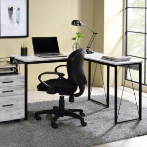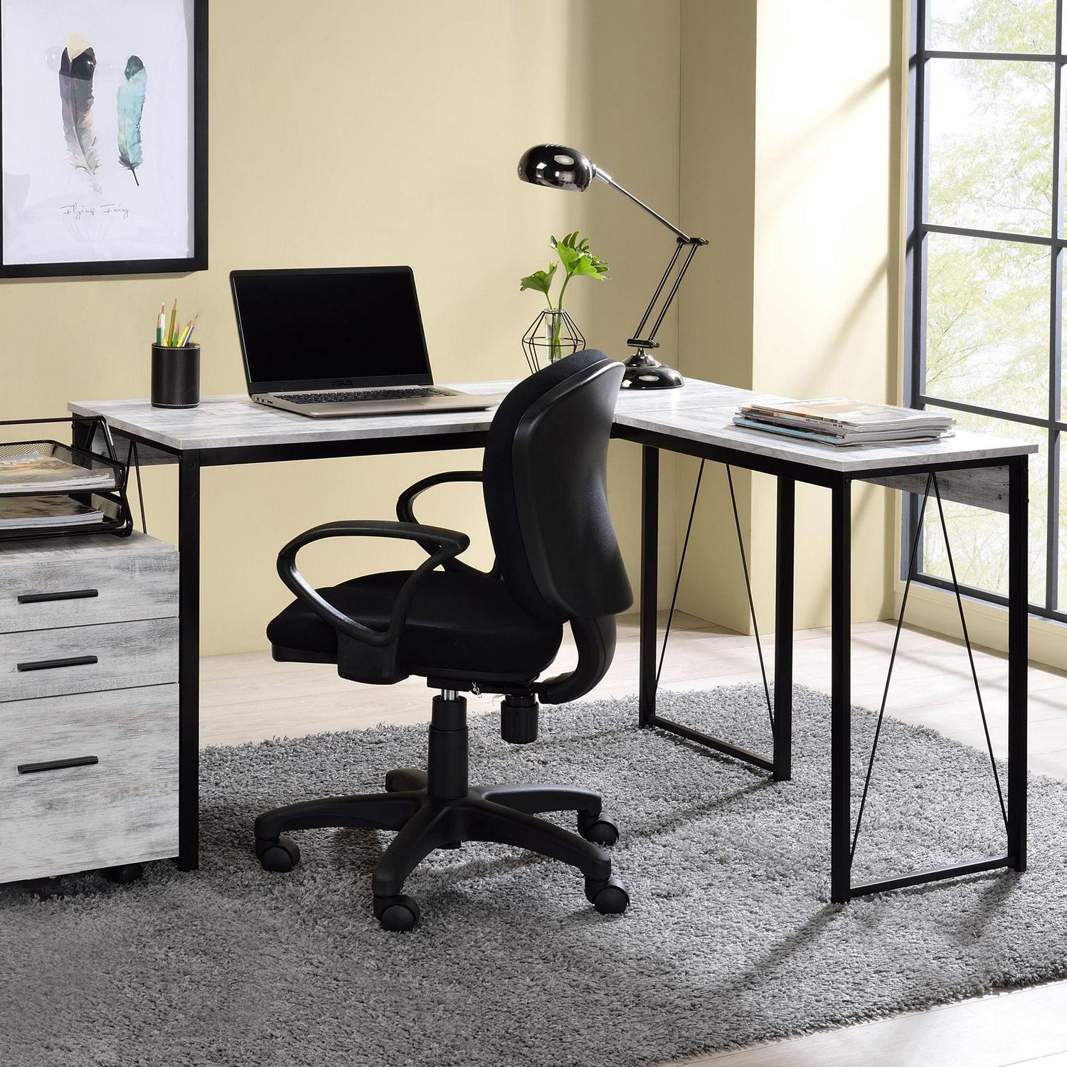Add a mixed elements appeal to your office with this rustic industrial design. The Zetri Desk boasts a L-shaped top with a open sled base for a spacious workspace. The black metal frame keeps silhouettes neat,with reverse “V” shaped support for extra stability and style ,while wooden table top and apron soften the whole product with a rustic wood finish. Use the Collection desk to create a efficient and stylish workplace for your office