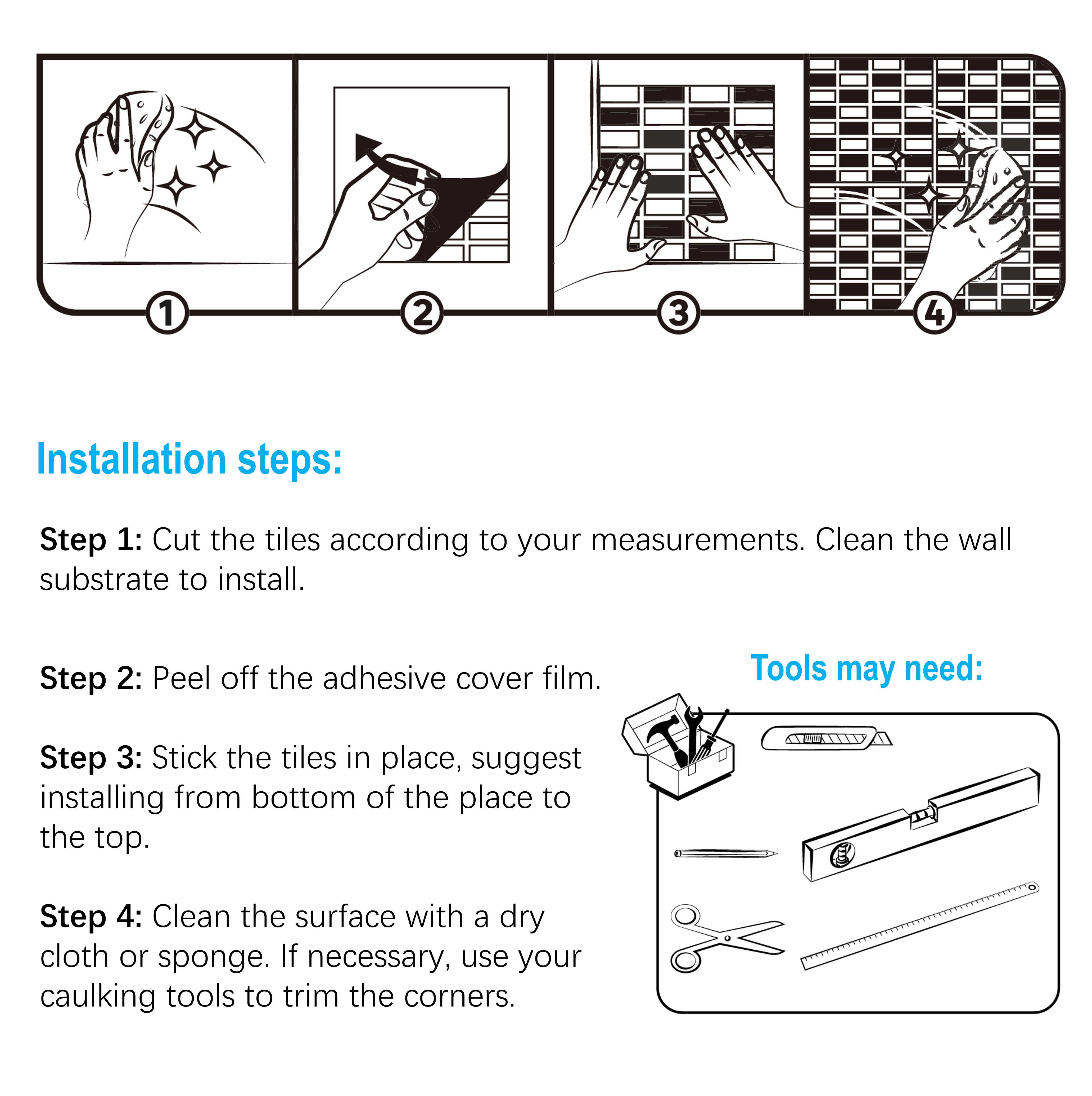 1. EASY & CLEAN USE: These are Peel and Stick Mosaic Tiles, no need grout, clean, quick and easy. 2. MATERIAL: real natural mother of pearl, hand made. 3. FINISH: Glossy, PATTERN: Mini Subway, Streight edge. 4. COLOR: Ivory white with natural variations. 5. NUMBER OF PIECE: 6 tiles (5.81 sq. ft.), TILE THICKNESS:4mm 6. RECOMMENDED: backsplash, kitchen wall, bathroom wall, TV background 7. DIY for: fireplace surrounding, mirror frame, cabinet doors or panesl, table top etc. 8. NOT RECOMMEND: shower area, floor use, outdoor use. 8. EASY MAINTANCE: Just use wet cloth to mop the tiles slightly. 9. FIT MANY STYLES: such as Rusitc, Nature, Classic etc. 10. NOT RECOMMEND: shower area, floor use, outdoor use.