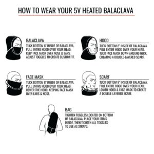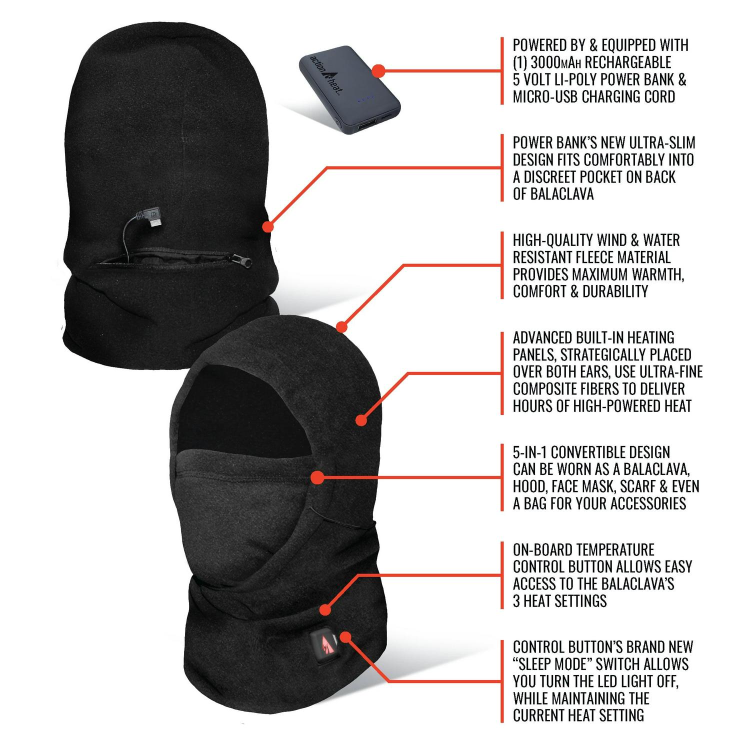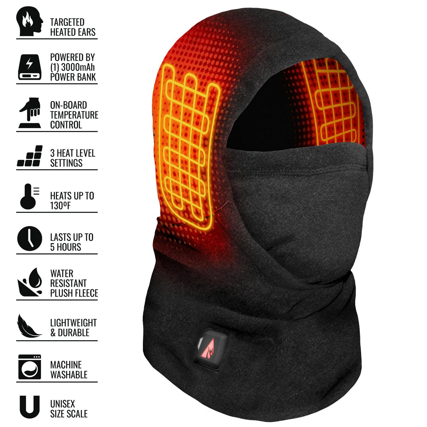 – Includes: (1) ActionHeat 5V Heated Balaclava w/ heated ears (1) ActionHeat 5V Power Bank (3000mAh) (1) USB Charging Kit