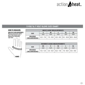 The Everyday Heated Gloves from ActionHeat for Women are powered by a 7 volt battery, so your fingers and hands stay warm for up to 5+ hours! When you need a heated glove for those everyday tasks, such as walking the dog, running errands, watching your favorite sports outdoors, or whenever you want to keep your hands warm, the Women s Action Heat 7 Volt Everyday Gloves are perfect. Don t get caught out in the cold; wear the ActionHeat Women s Heated Everyday Gloves! HOW TO USE: 1. Fully charge battery packs 2. Plug batteries into gloves 3. Press and hold button on gloves to turn on 4. Press button again to select heat level Features: Lightweight and comfortable Powered by two ultra-slim 7.4 volt 2,200 mAh rechargeable Li-poly batteries Batteries fit neatly into discreet and easy-to-access pocket on back of the glove Touch-button temperature control with 3 heat settings Heats entire length of each finger as well as the thumb and back of the hand Material Content: Heating system made of ultra-fine composite fiber built-in to evenly distribute hours of heat Estimated Heating Time: High (Red): 150F – 2+ Hours Medium (White): 130F – 3+ Hours Low (Blue): 110F – 5+ Hours Includes: (2) ActionHeat Everyday Gloves (2) Rechargeable 7V Batteries (1) Dual Charger (1) Instruction Manual