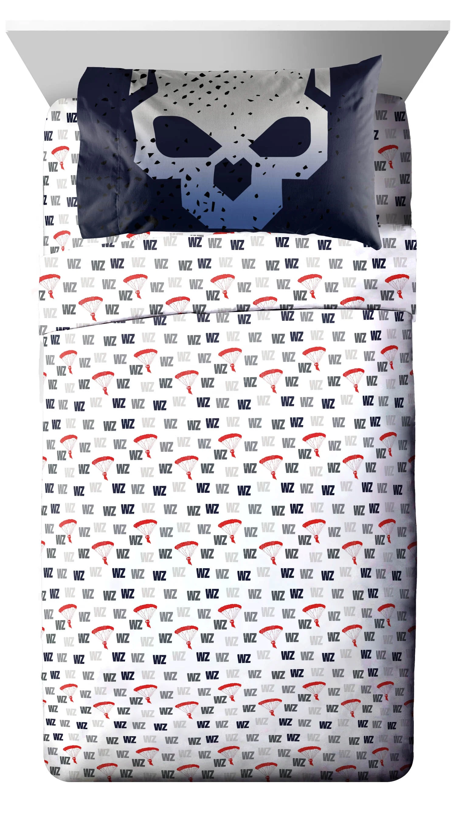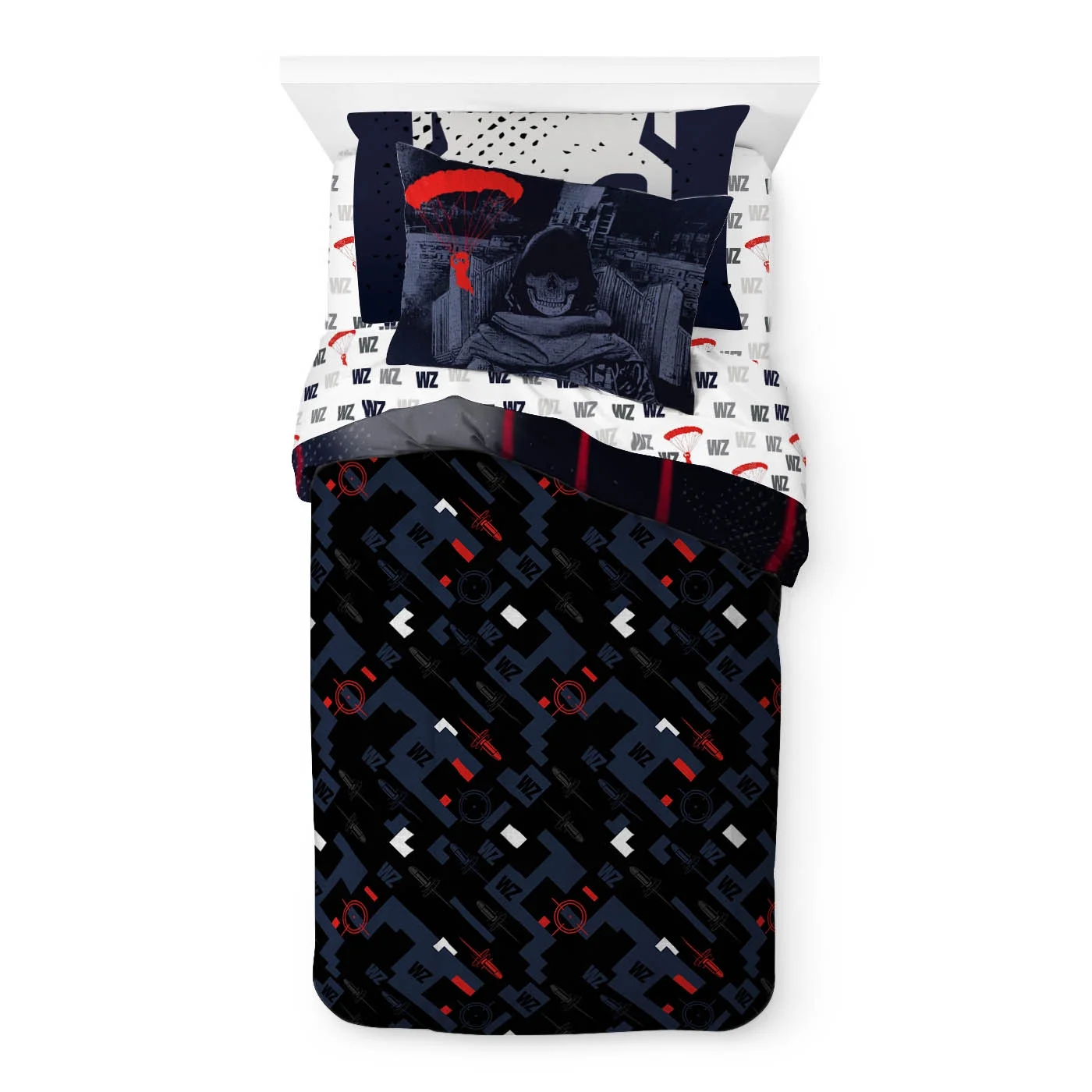 Leave no man behind with this Call of Duty 5 Piece Kids Reversible Twin Bed Set with Sham. Set includes a comforter, one sham, fitted sheet, flat sheet, and one standard sized pillowcase. This bed set features Call of Duty Warzone artwork atop allover printed sheets. Made from 100% Microfiber, this bed set is the perfect weight to keep your child comfortable all year round. Simple care instructions include machine wash cold and tumble dry low. Complete the look by shopping our other Call of Duty home and bedding items, sold separately on .