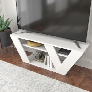 Imagine the possibilities with this tv stand side table that has slanted supports in a lively configuration. Finished on all sides so it can also be used up side down. Great for added a simplistic wow factor to any room. Manufactured from melamine coated engineered wood for strength and durability. Each shelf can hold up to 20 lbs. Ada Home Decor Furniture for TVs up to 48″ 2 Tier Open Shelf White Todd Modern TV Stand would be a good storage for your gaming accessories, components for your television, also perfectly fit into your living room, guest room, entertainment areas, or anywhere.