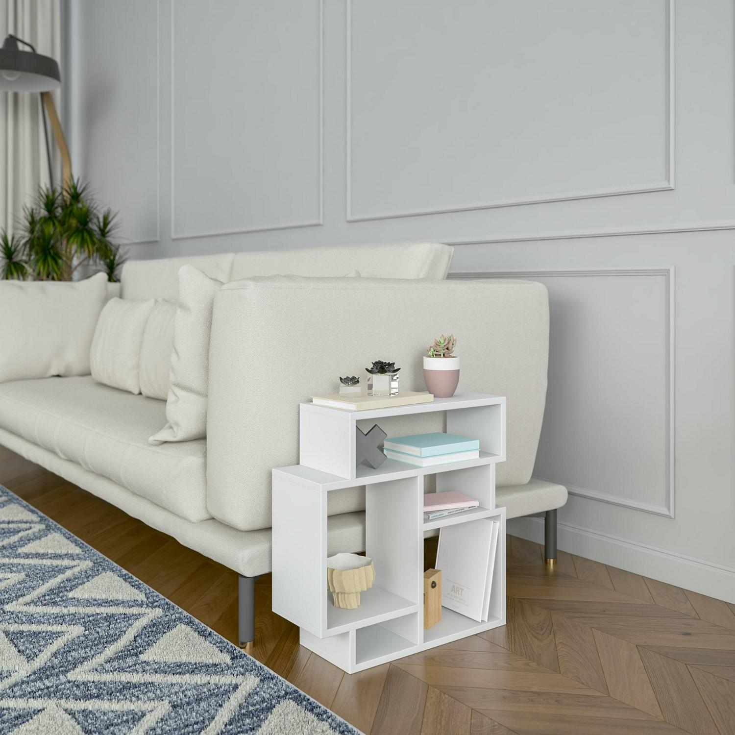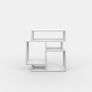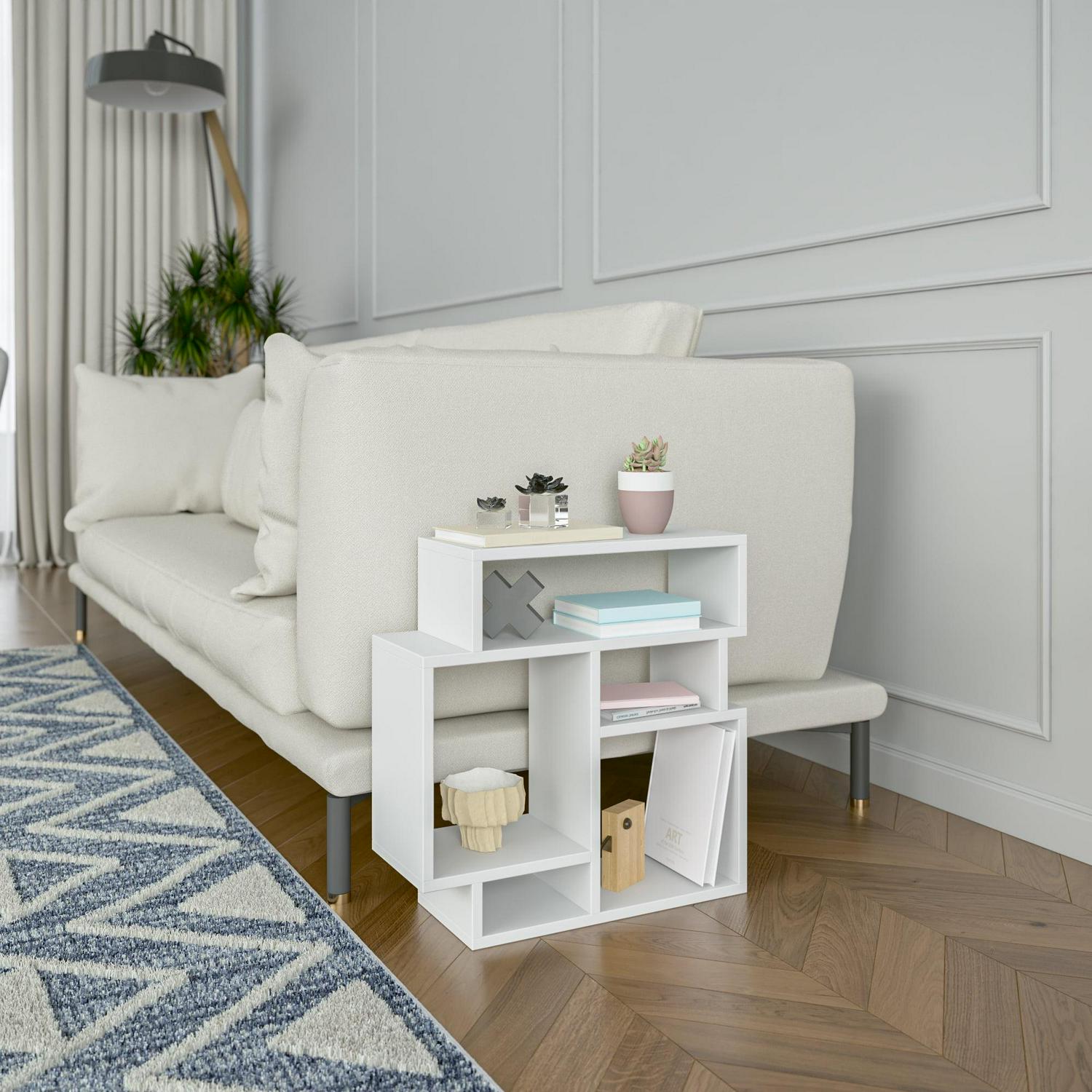 This fresh and fun side table bookcase will add a touch of modern style to any room. Retro asymmetrical design is finished on all sides to be reversible and flippable. Perfect for a living room, dining, room, bedroom, or anywhere you need great looking extra storage. Manufactured from melamine coated engineered wood for strength and durability. Each shelf can hold up to 20 lbs. Ada Home Decor Furniture White 2 Tier Schultz Modern Side Table can be placed on either side of your sofa to store remote control, snacks and your drinks while watching TV.
