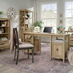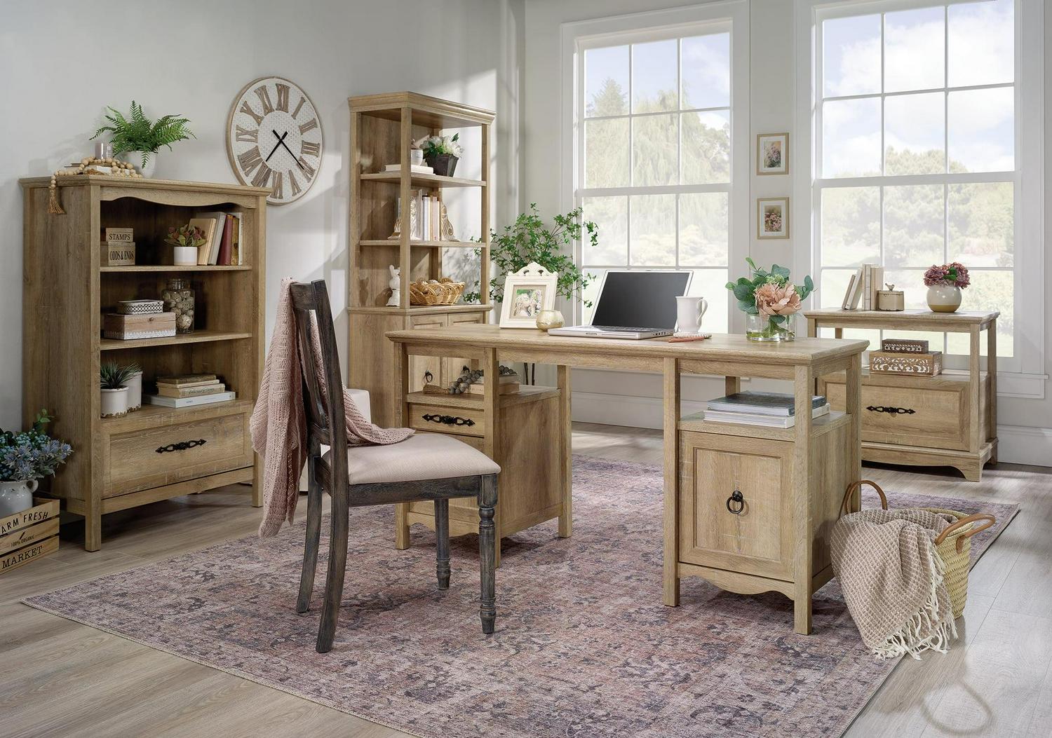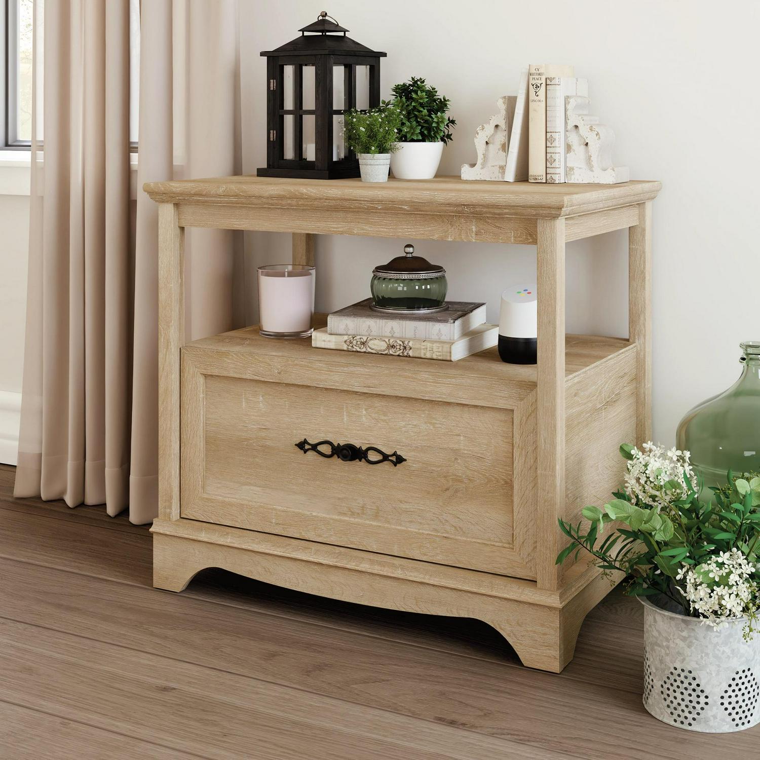 This lateral file cabinet combines all the essentials of a perfect filing cabinet with the eclectic coffee house design of the Adaline Cafe collection. This single drawer lateral file cabinet features a spacious drawer with full extension slides that hold letters or legal-size hanging files. Your most important documents are never far out of reach and are organized and easy to find. An open shelf below the top surface of this wood lateral file cabinet is the perfect place for books, binders, or other home office essentials. The spacious top surface allows you to display photos of your family, a lamp, home decor, and more. Finished on all sides for versatile placement in any room of your home, this file cabinet with a drawer will look great no matter how you arrange it. Finished in a universal Orchard Oak, this legal-size file cabinet makes storing your files easier than ever, and it looks good doing it.