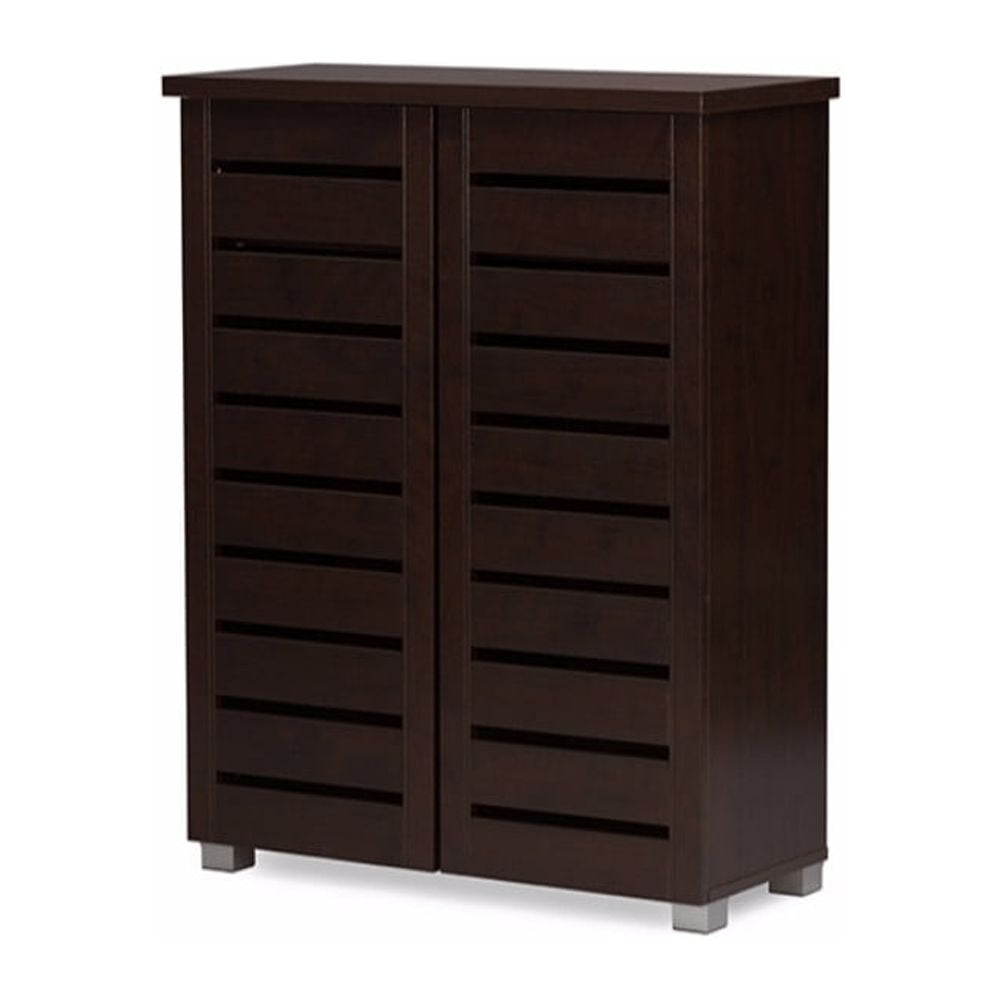 Finish: Dark brown finish 2-door version comes with 4 fixed shelves providing 5 shelving space 2-door version fits up to 15 pairs of shoes Slatted doors for ventilation Suitable for hallway