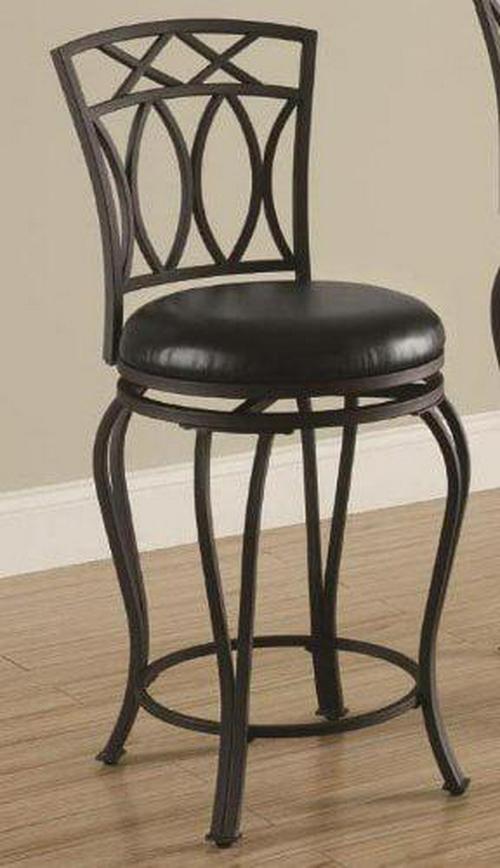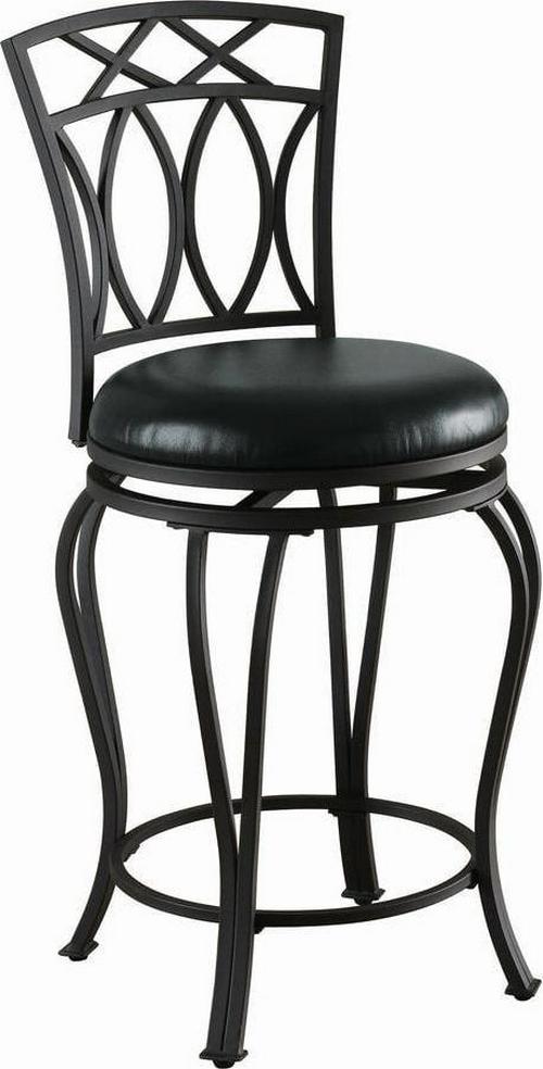 Casual, transitional style highlights this metal swivel counter stool. Perfect for an inviting kitchen island, the stool boasts a rich black finish. Coordinating black faux leather maintains a rich appearance while offering a surface that’s easy to wipe clean. A decorative back features X accents over curved embellishments. Complete with a built-in footrest for added comfort and support.