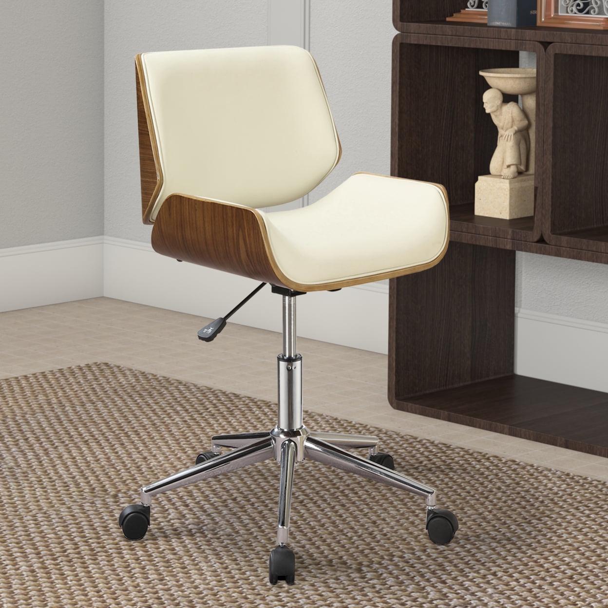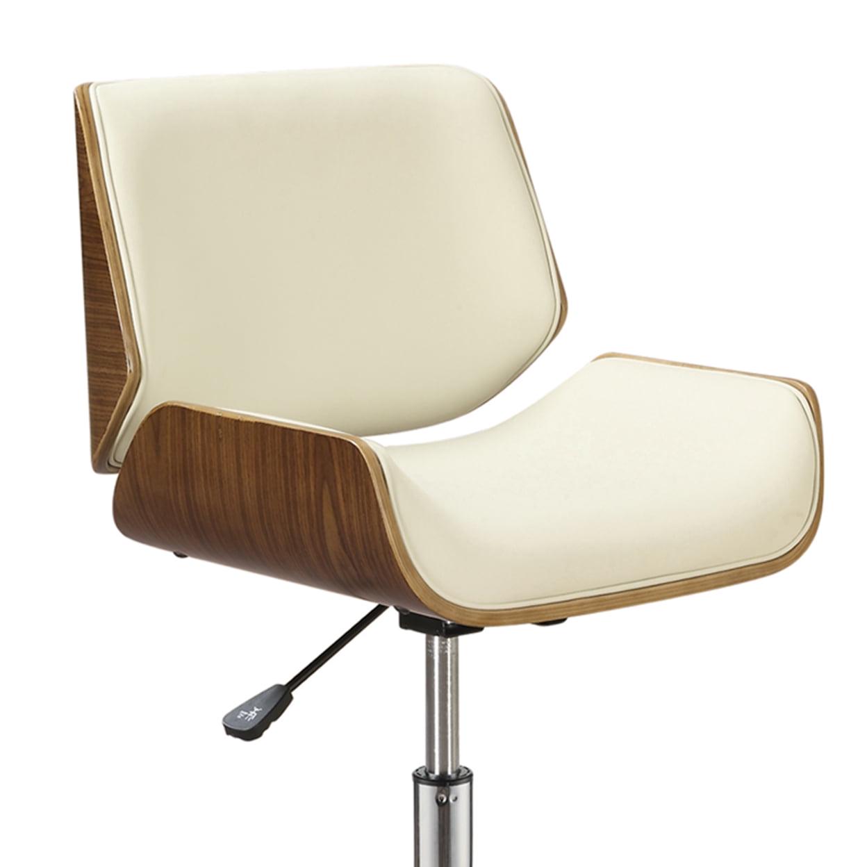 30 Inch Office Chair, Curved Back and Seat, Wooden Support, Cream Leatherette Comfortable and luxurious, this exceptional Contemporary Small-Back Home Office Chair, is designed to create a uniquely modern and chic office space. Ultra modern and chic chair is upholstered in beige leatherette and finished in walnut. This excellent office chair features an adjustable seat, a swivel design, and caster wheels to provide easy access to your surrounding work area. Crafted from wood and veneer, this chair has a contemporary design.