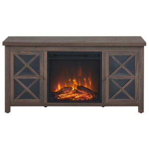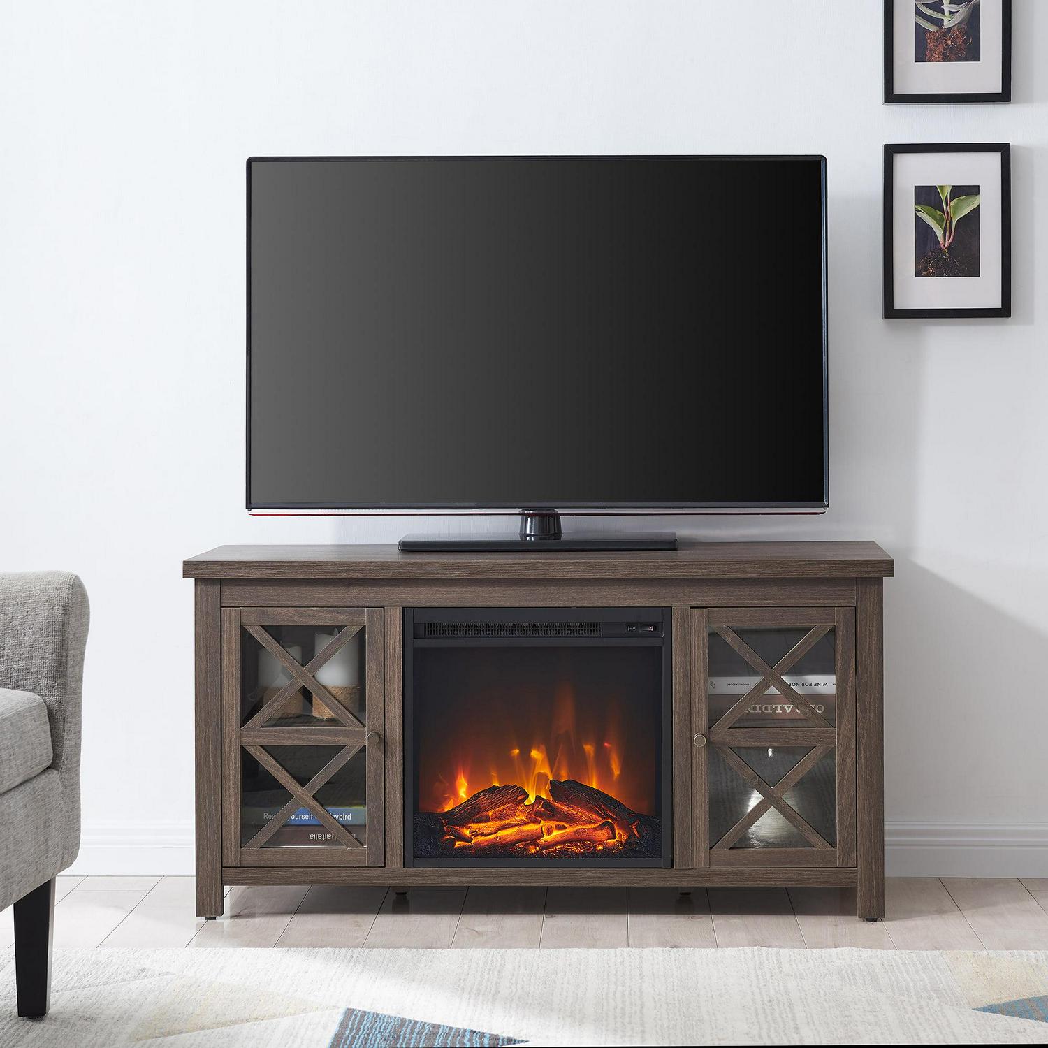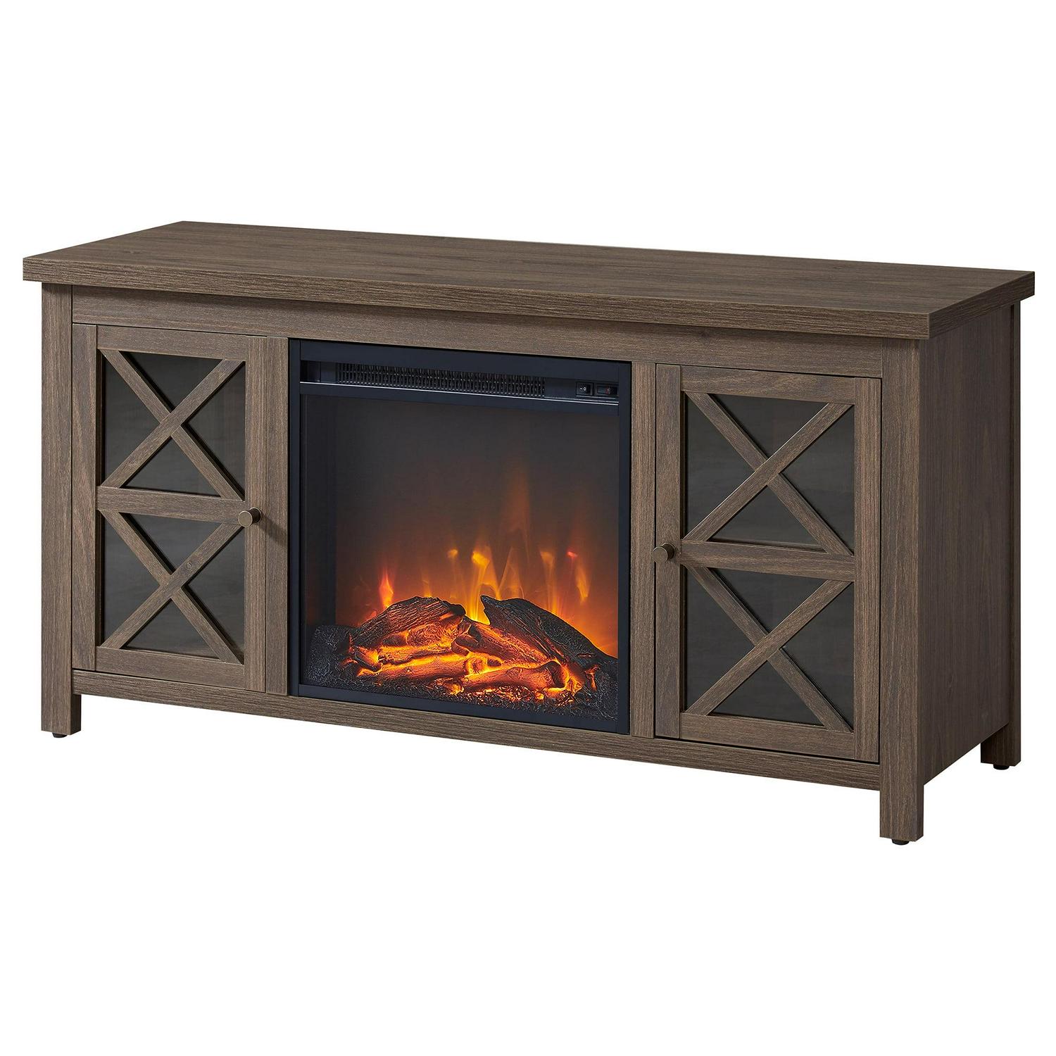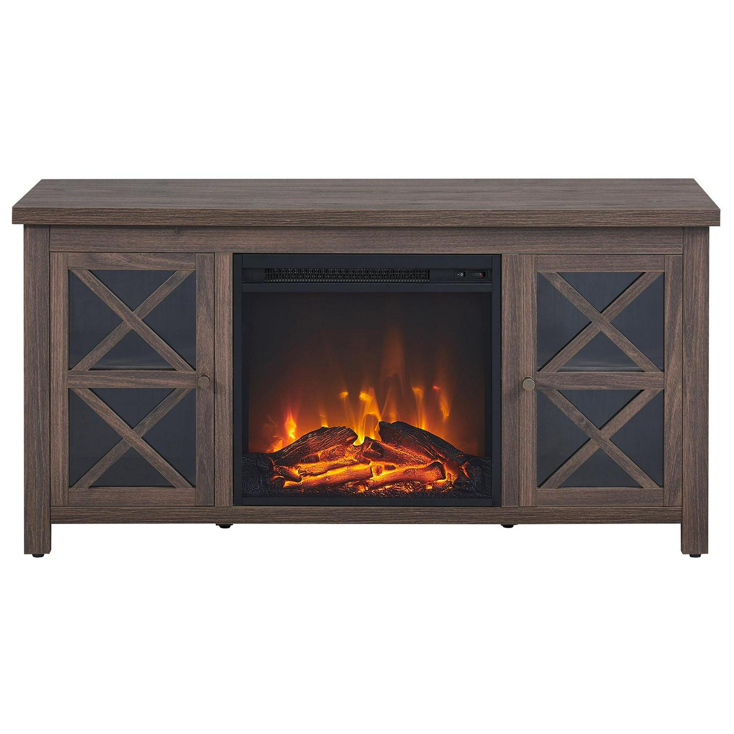 Combine functionality and on-trend design with this sturdy TV stand, featuring an inset electric fireplace. Its rich wood tone creates a warm neutral palette that will blend seamlessly into any color scheme, while its crisscross-accented cabinet doors add a touch of modern farmhouse whimsy. Stay warm and cozy while you take in the big game, a movie marathon, or that season finale everyone s been talking about.