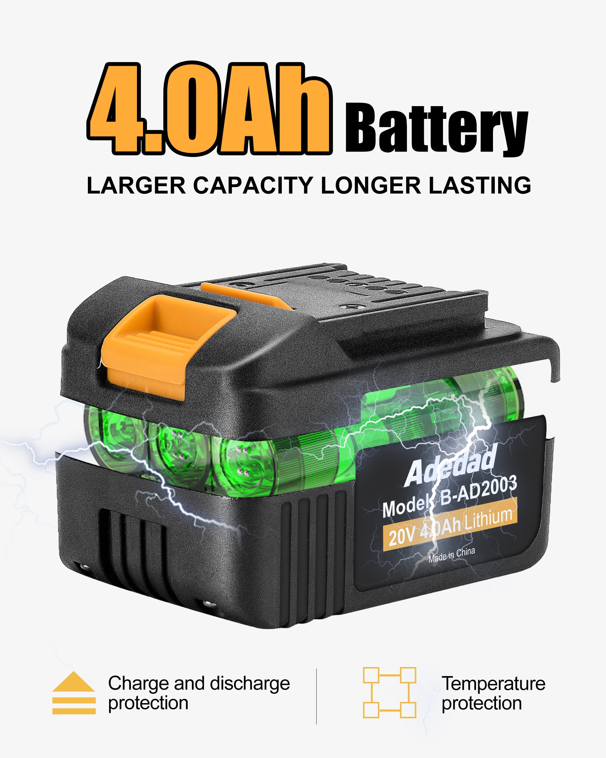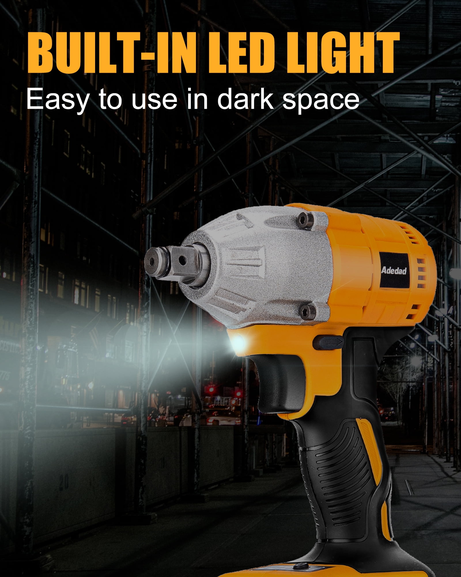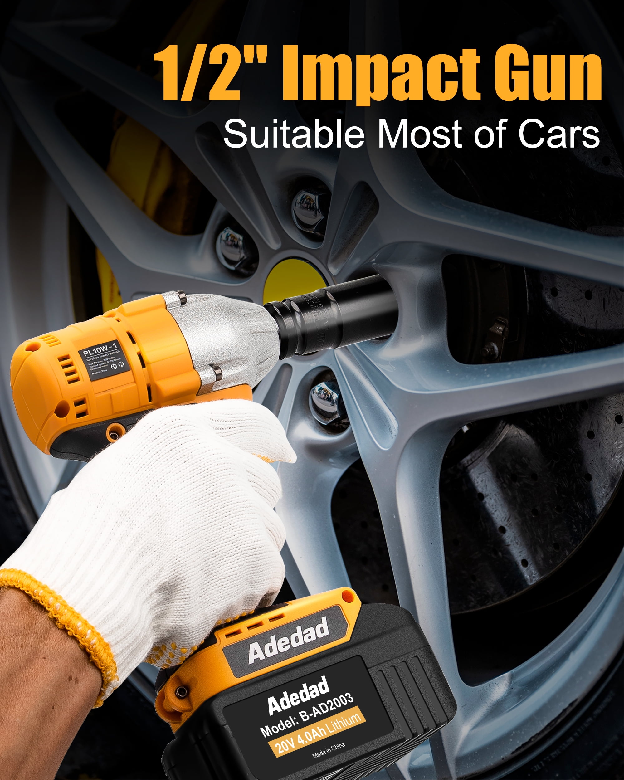 Adedad 20V 1/2 INCH CORDLESS IMPACT WRENCH Adedad cordless impact wrench has a powerful generator. 20v impact cordless wrench delivers 300 Ft-Lbs of torque and a maximum speed of 2900 RPM. Compared with brushes motors, the brushless motor has a longer use life, less battery energy loss, lower machine running noise level and greatly safer working conditions. It allows you to tighten and loosen nuts and bolts easily! Specifications: Cordless Impact Wrench Model: PL10W-1 Rated Voltage: 20V NO-load Speed: 0-2900 RPM Chuck Drive: 1/2 inch Torque Force: 300 ft-lbs(400Nm) Battery Type: 20V Lithium-ion, 4.0Ah Charge Time: 2.0 H Package Dimensions(L*W*G): 11.8*7.8*3.5 inches Package Weight: 7.7lb Package Included: 1*20v Brushless Impact Wrench 1* Fast Charger 1*4.0AH Lithium-ion Battery 1* Connecting Rod 7* Impact Sockets 1* Operation Instruction 1* Tool Bag A pair of protective gloves