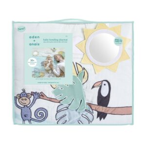 Playtime for two. Play and explore, side-by-side with baby, with the new baby bonding playmat from aden + anais. Generously sized for parents and baby to interact during tummy time and play, this hand-embroidered cotton muslin mat piques baby’s curiosity with fun sights and textures to explore. From rattles and tactile elements to removable plush toys and sun mirrors, the baby bonding playmat has 30+ developmental benefits to support the baby’s fine motor, sensory, cognitive, and gross motor development. Grab a front-row seat as the baby reaches developmental milestones, like strengthened neck and core muscles, by encouraging tummy time on the thick and comfy baby bonding playmat. From self-discovery with the sun mirror to sensory development with the crinkle peek-a-boo leaves, adventure awaits as the baby enters each different discovery zone. Designed to capture babies’ attention and engage their developing senses, the reversible design features our globally best-selling jungle jam print in a variety of colors and textured fabrics. When playtime is over, fold the mat over to feature its stylish print to complement your home. Each baby bonding playmat is made of high-quality 100% muslin combed cotton with 100% hypoallergenic poly fill. All appliques are sewn manually by skilled artisans through hand-guided embroidery machines and hand-finished to create the perfect shape for each embroidered motif.