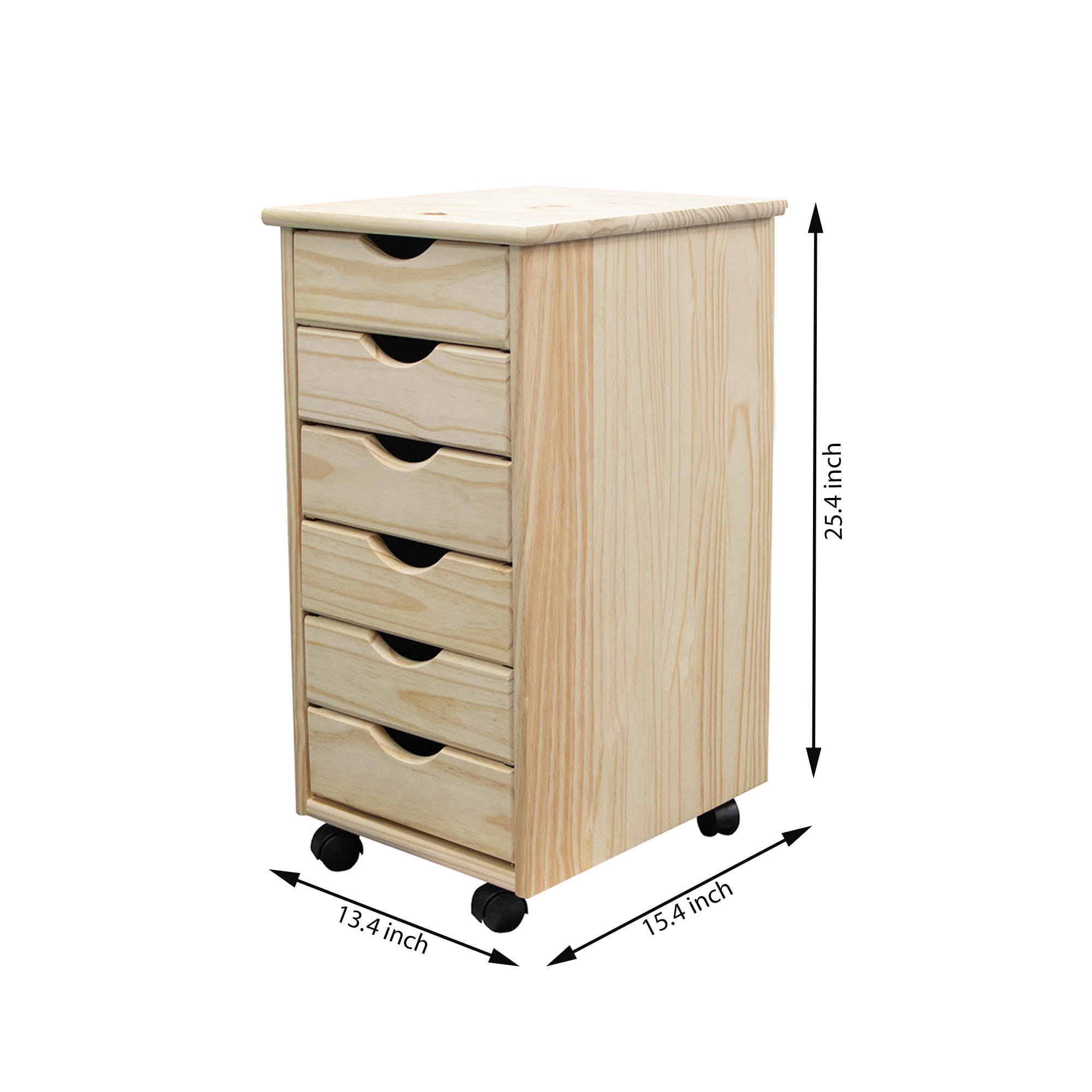 Solid Wood, no particle board, including drawer sides. Drawers are easily removed to be carried to a working area for crafting / sewing Drawer accepts a ream of 8 ½” x 11” paper, or kitchen wrap Can be refinished or painted. 5. On casters for mobility. Assembled Dimensions: 15.4” x 13.4” x 25.4” 7 Inside Drawer Dimensions: 9.65” x 12.32” x 2.67” Sustainable plantation grown pine. Non toxic finish. Available colors – Unfinished, Black, White and Medium Pine Roll Cart