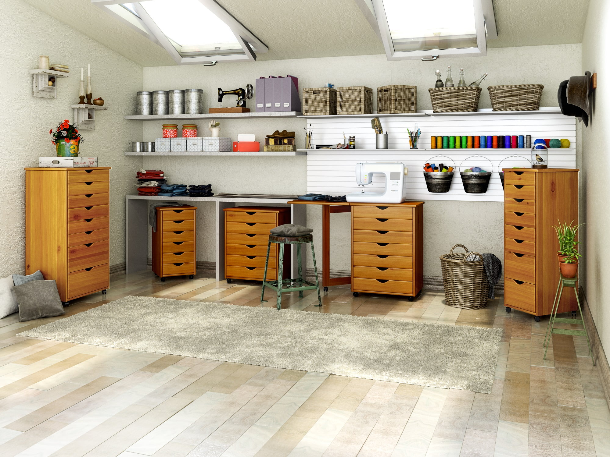 Provide your craft-table, sewing room, or workshop with an all-in-one storage solution. The Adeptus Six + Two Drawer Roll Cart has a tall, skinny profile that conceals eight total storage drawers in one convenient location. Each drawer features a full-extension design with six top drawers snugly fit standard letter-sized paper and other small items, such as pens, pencils, sewing supplies, and more. Two bottom drawers boast extra-deep for keeping larger items (like books, tools, and toys). The frame is outfitted with four casters to allow for easy movement and repositioning. Thick, durable pine is used to construct the cart, finished in a natural medium-pine for an authentic appearance. A safety strap is included to securely attach the unit to the wall. Assembly is required