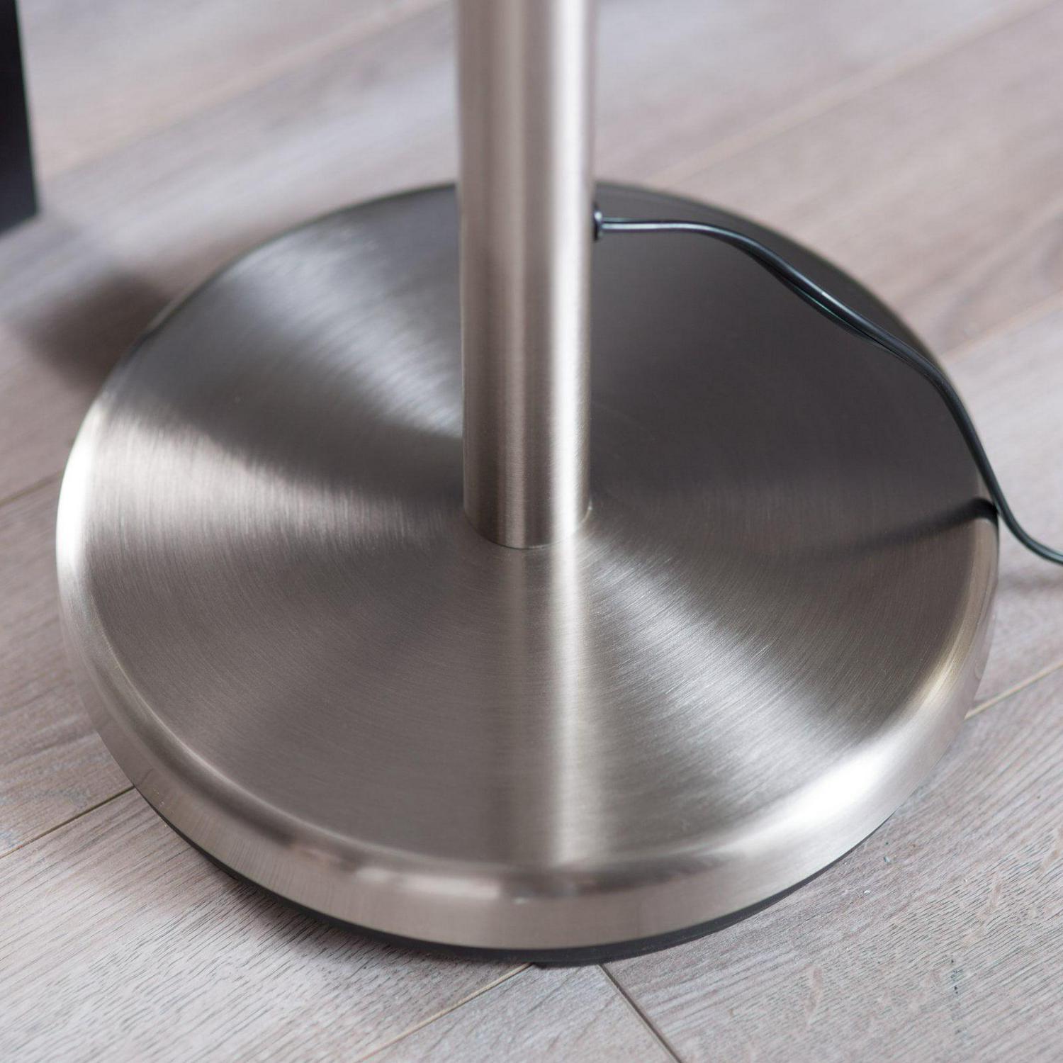 - Curved metal pole base with satin-steel and chrome finish