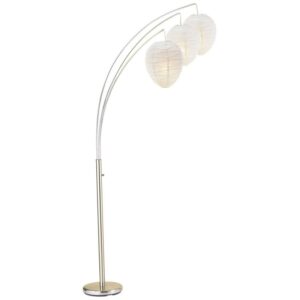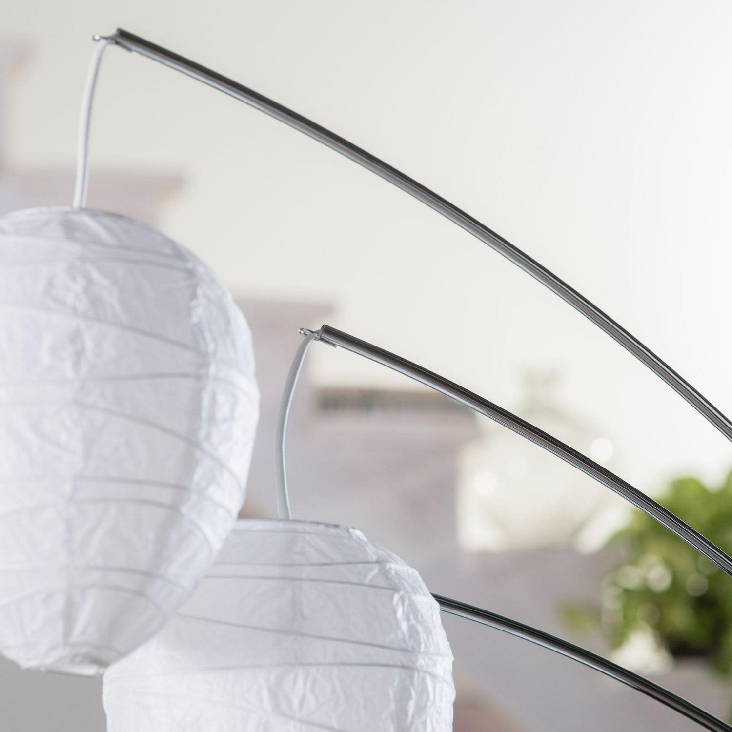 The Zen-inspired Belle arc lamp can create a relaxing environment for the living room. White beehive shaped rice paper lanterns are suspended from curved chrome poles creating a warm, ambient glow that lights up a sectional area or living space. A rotary switch on the pole turns the lamp on and off. This lamp is smart outlet compatible. Bulbs are not included.