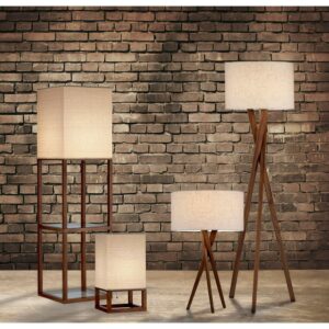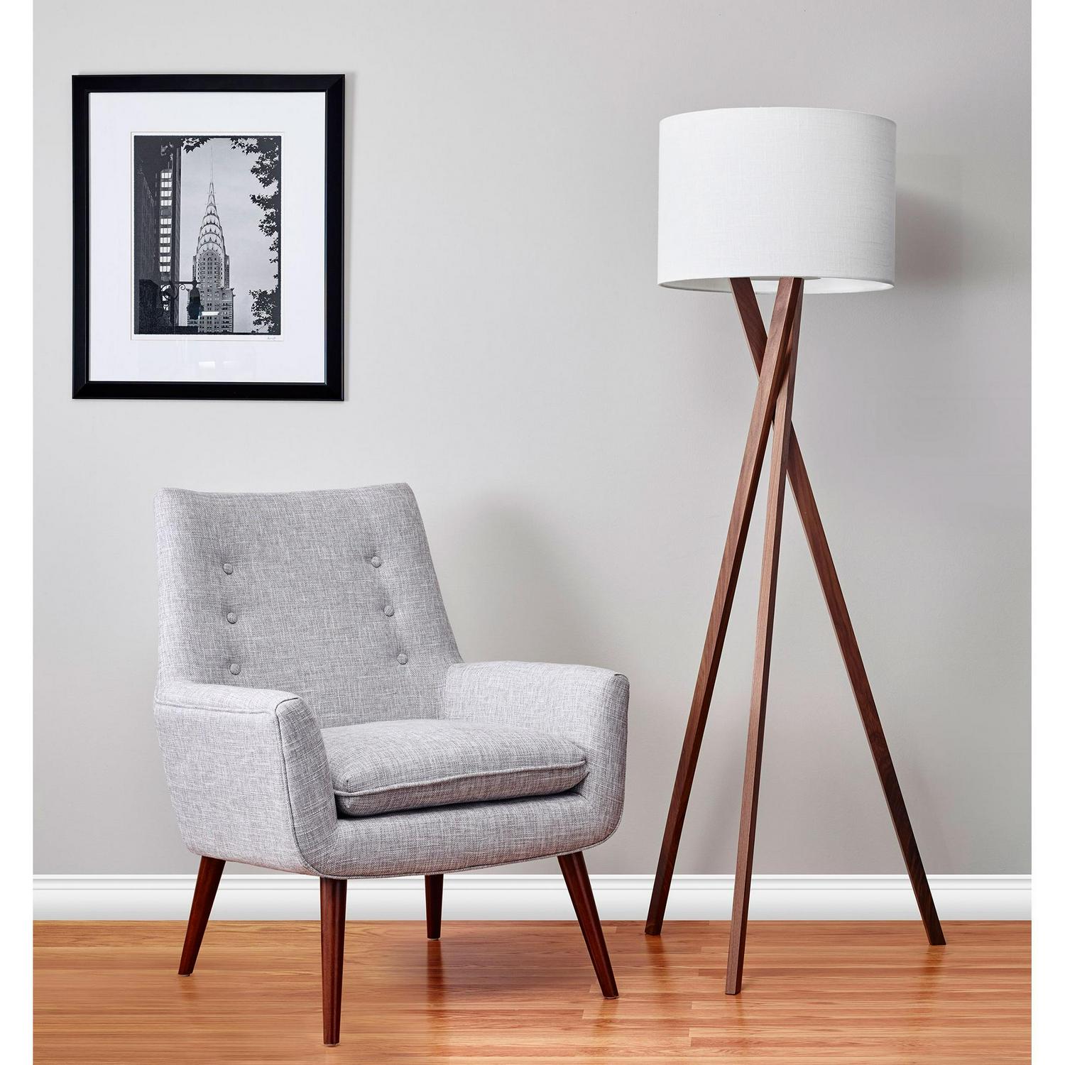 – Decor Floor Lamp: A sleek light walnut tripod base suits a variety of settings from contemporary, rustic, transitional to loft style. The legs attach to a metal disc that supports the socket and white textured linen shade for easy assembly. Overall height is 63 in. and the tripod base has a 17 in. footprint.
