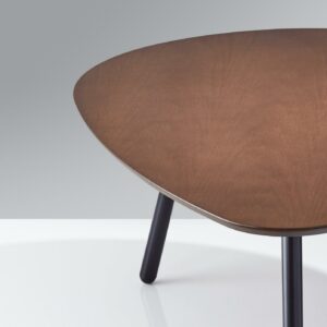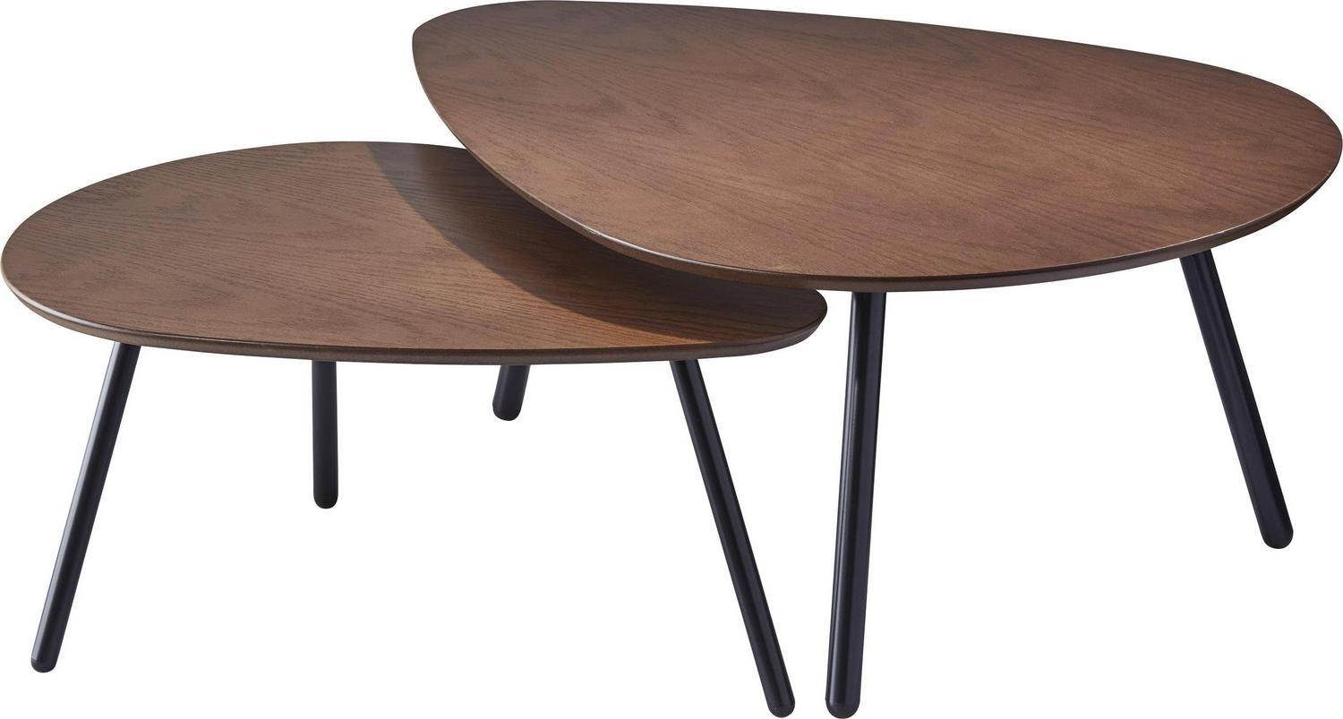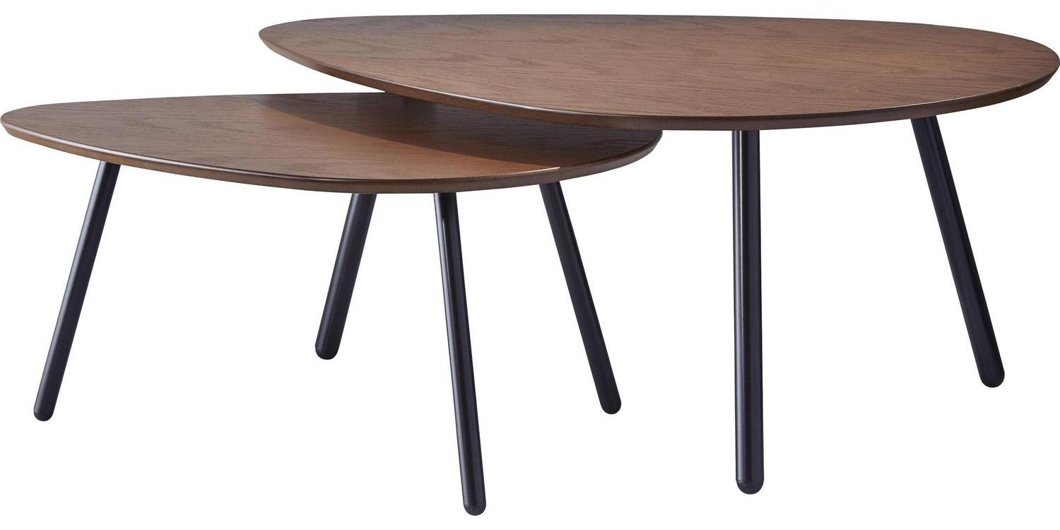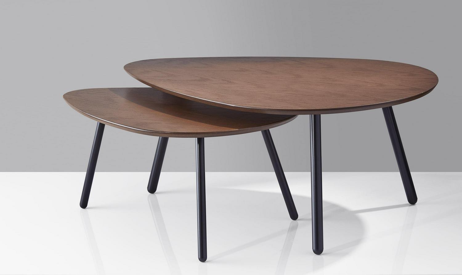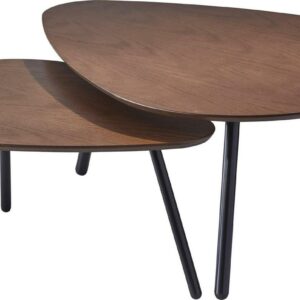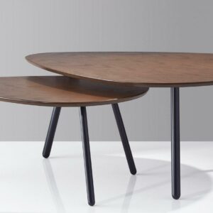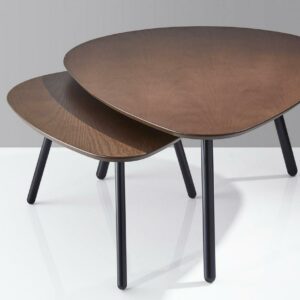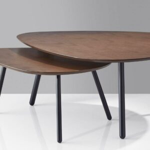 The Hendrix Nesting Tables provide the perfect tabletop solution for all needs. Nest the tables together from a coffee table that is the perfect size for you. Separate the tables and scatter them around the room for a cohesive living room style. The guitar pick-shaped tabletops are MDF with a walnut oak veneer and paired with matte black metal legs.