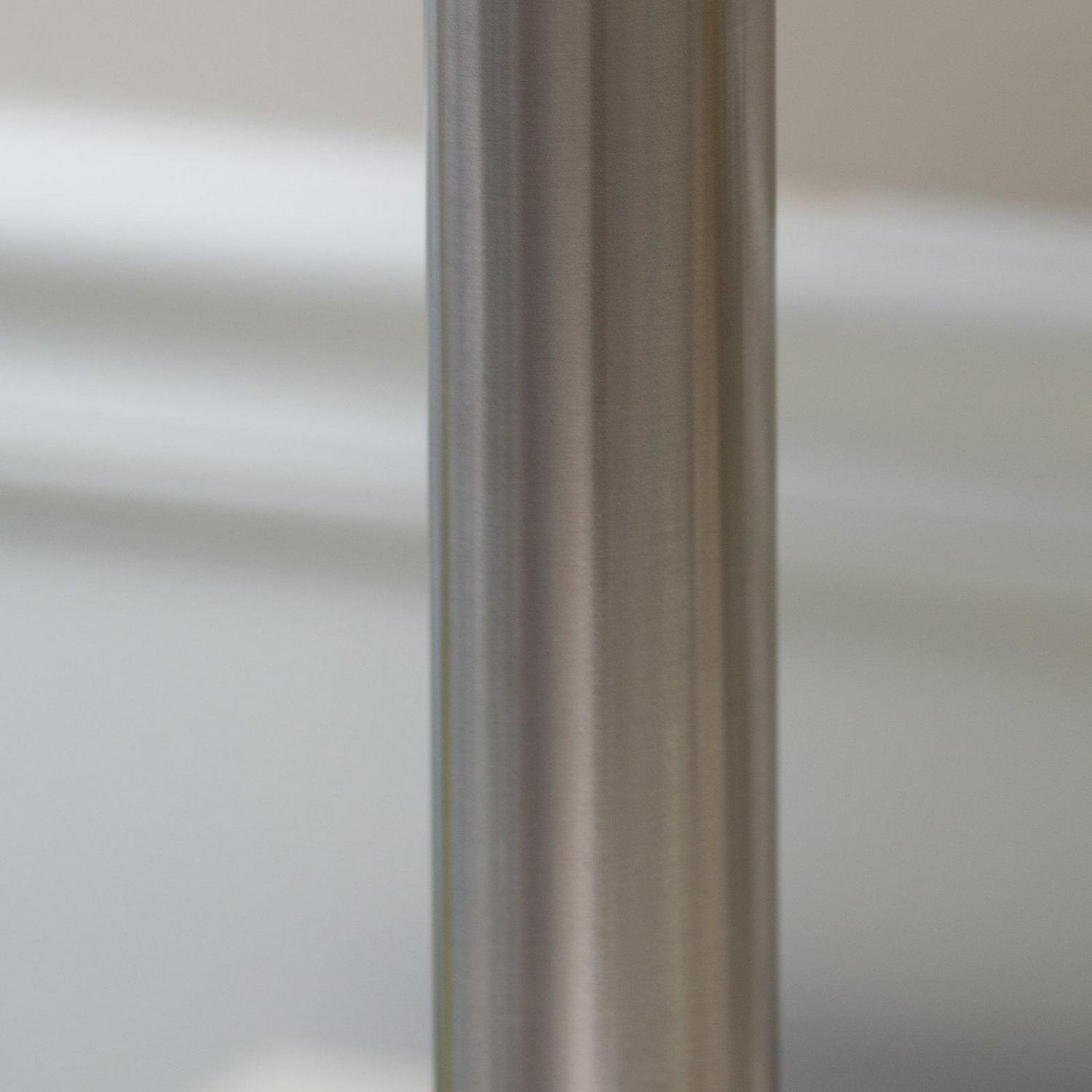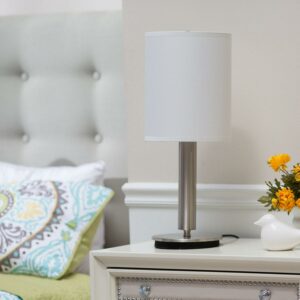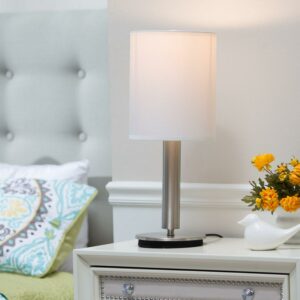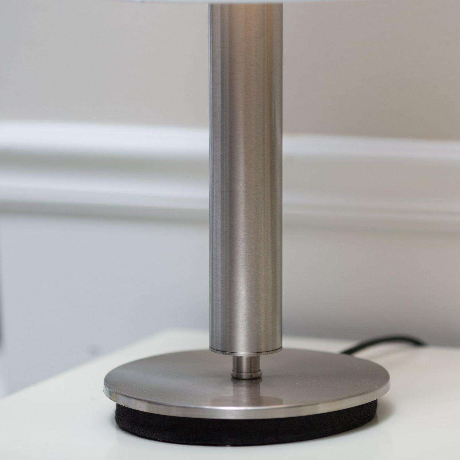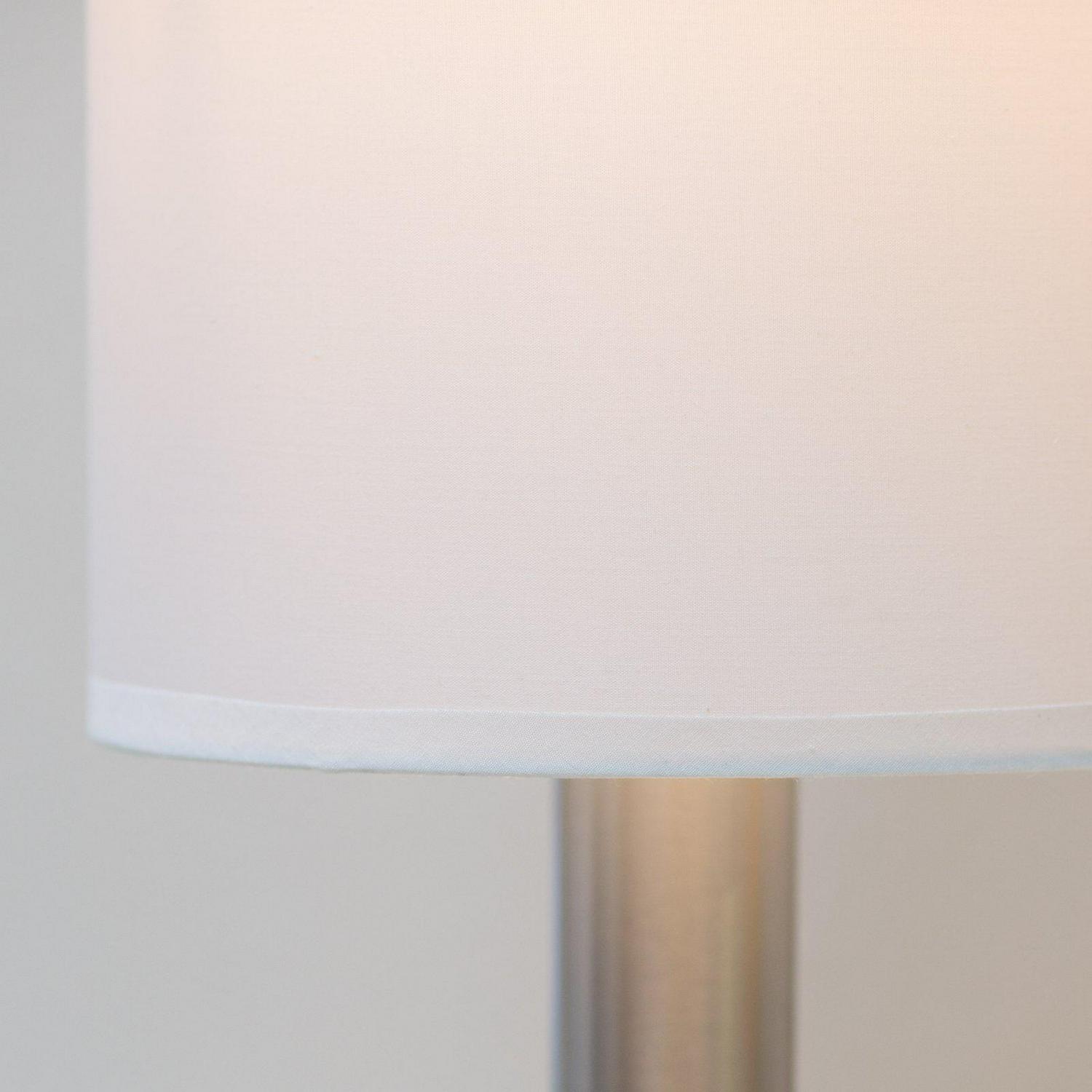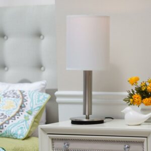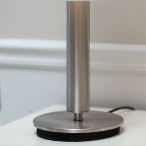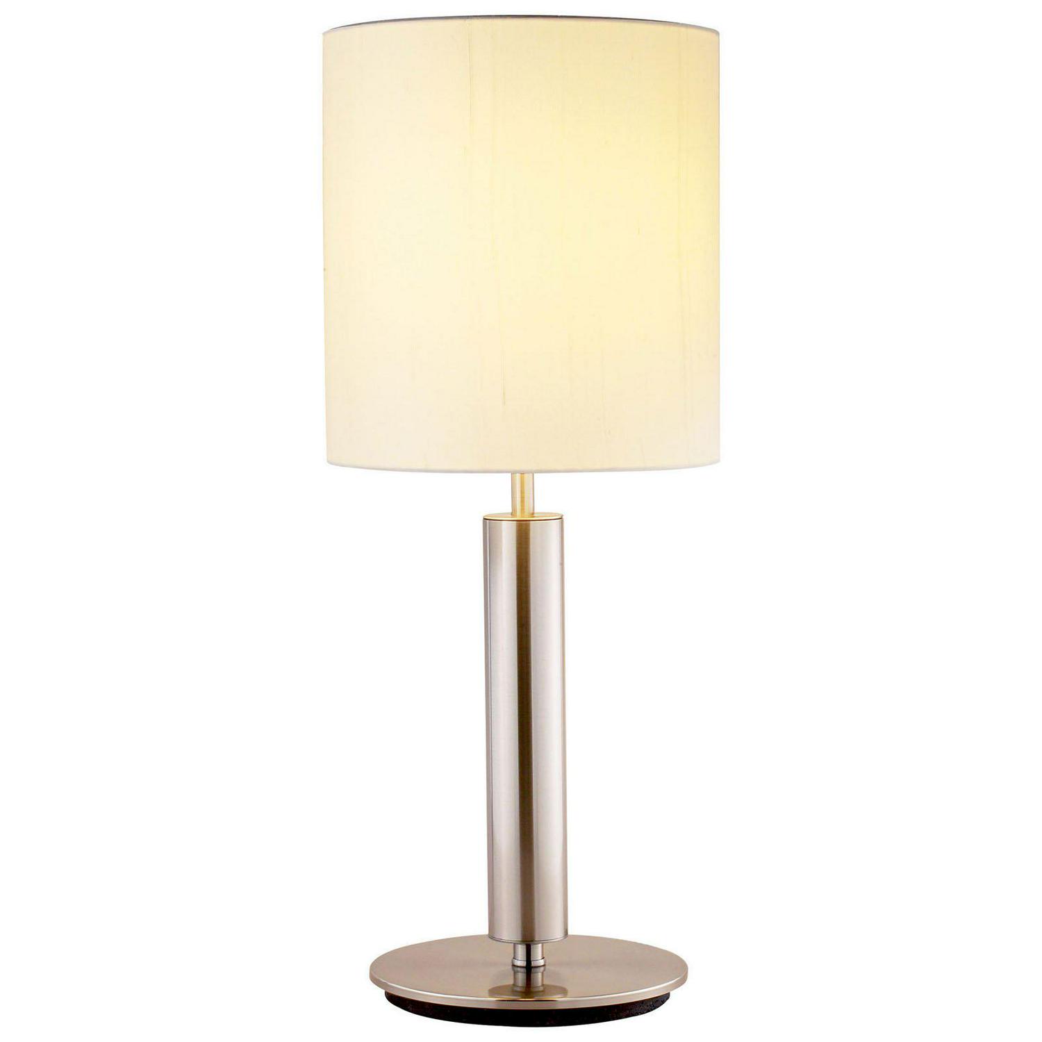 A simple, classic style with a bold presence, the Hollywood table lamp is the perfect choice for a modern bedroom or sophisticated living space. The tall ivory silk shade complements a chunky brushed steel pole. Control the light with a three-way touch sensor switch. This lamp is not compatible with CFL bulbs or smart outlets. Bulb is not included.