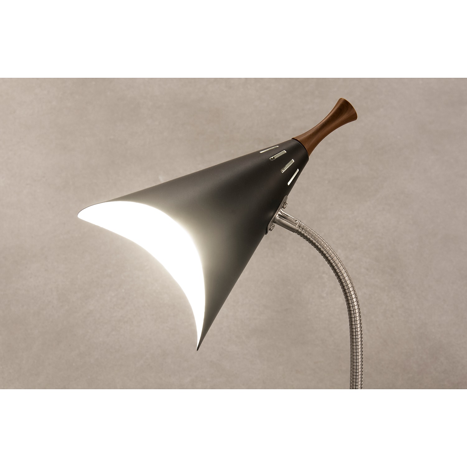 Achieve the mid-century vibe with the addition of the Adesso Draper Gooseneck Desk Lamp. The gracefully vented metal cone shades feature white interiors for maximum light reflection. Cone-shape shade can be adjusted vertically and horizontally for light exactly where you need it. Shade is painted white on the interior to maximize the illumination. Requires a 60W incandescent or 13W CFL bulb (sold separately). Gooseneck-style arm provides added flexibility.