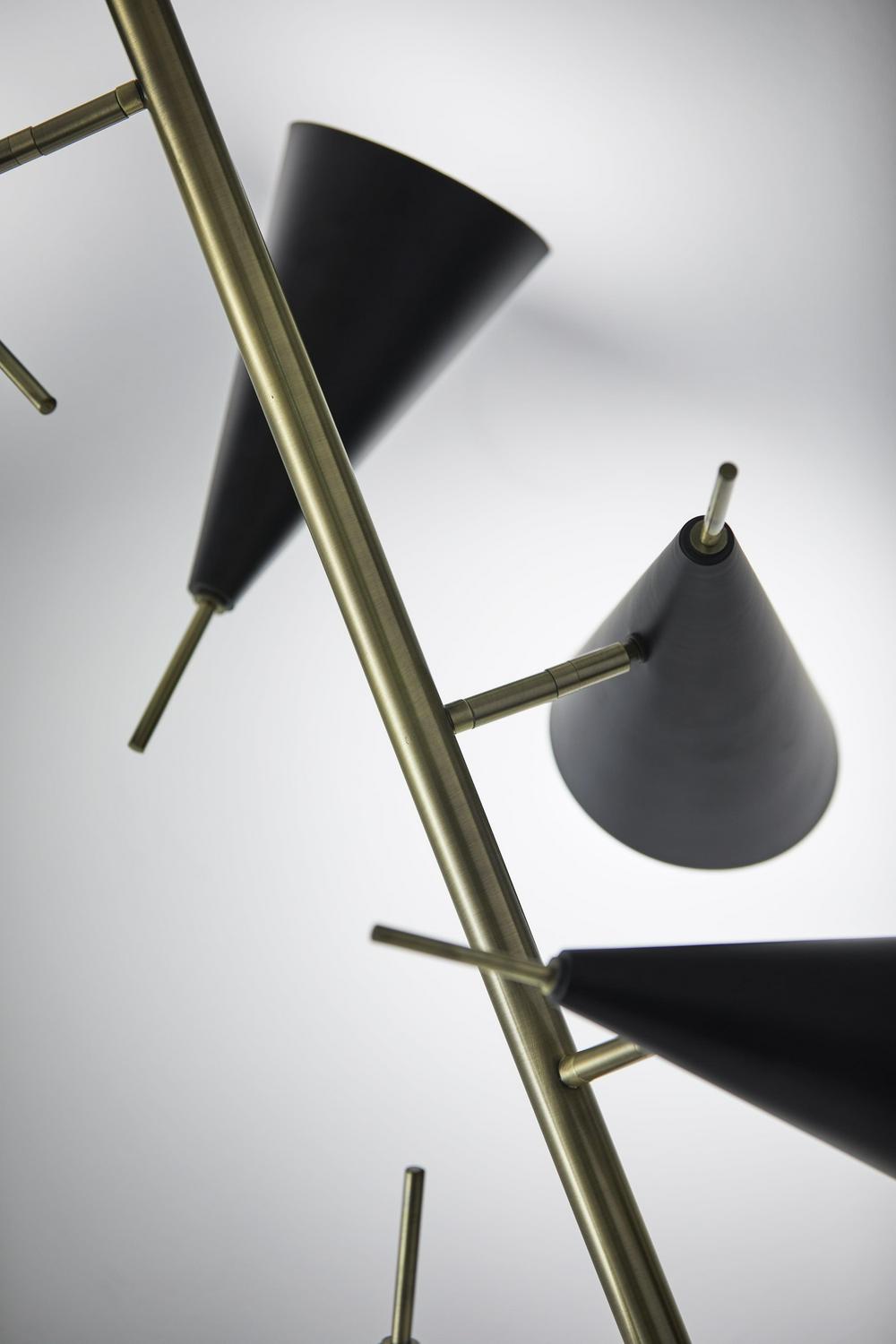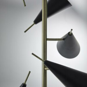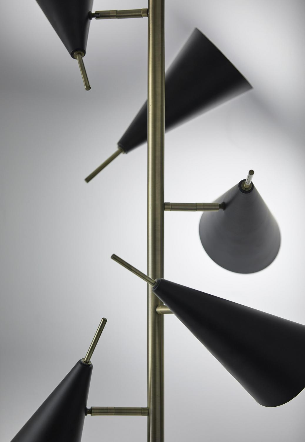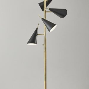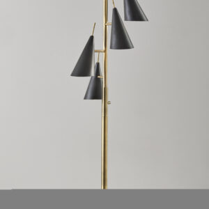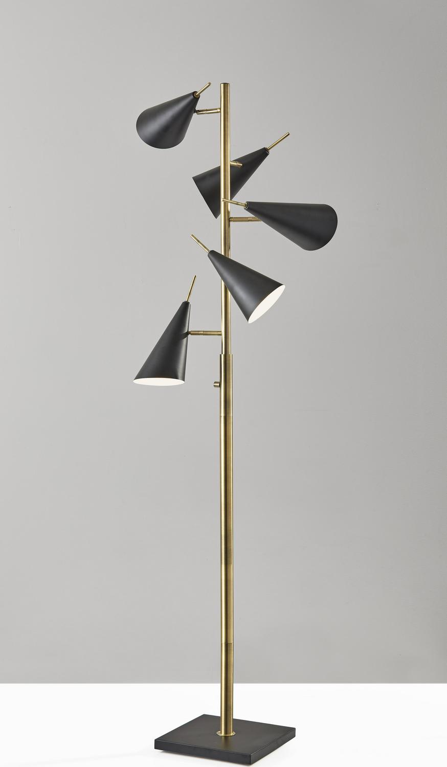 Inspired by vintage hollywood décor, the Owen Tree Lamp uses sharp angles and mid-century finishes to create a must-have retro-modern style. With five adjustable task shades, this lamp can work in various areas of the home. Place this lamp next to your desk to illuminate your workspace or in the living room corner for room-filling ambient lighting. An easily accessible brass on/off rotary switch is located on the lamp base. A rotary switch on the pole adjusts the light at four settings: 2 lights on, 3 lights on, all lights on, off.