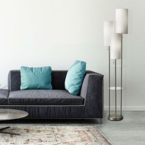 – Product Specifications: 68 in. height, 1 x 7.5 in. diameter, 1 x 6.75 in. diameter, 1 x 6 in. diameter shades, brushed steel finish, 3 white linen fabric shades, 2 clear acrylic shelves, this lighting product is ETL listed, meaning that it has been tested and approved to meet the government-regulated safety standards for the USA.