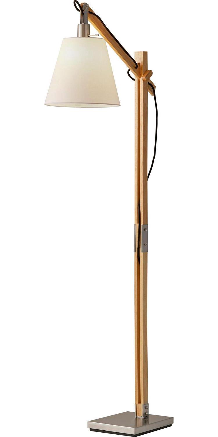 – Decor Floor Lamp: Introduce this Walden floor lamp into rustic, contemporary or eclectic settings. Wooden joints adjust the balance arm to change the height and angle of the shade. The black fabric cord threads through the square wood post body and drapes out the back. The satin steel base and accents enhance an industrial style, while a clean off-white fabric shade softens the look.