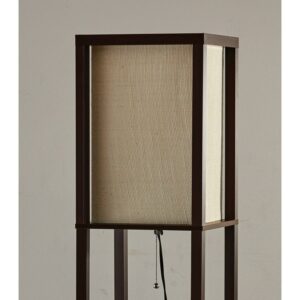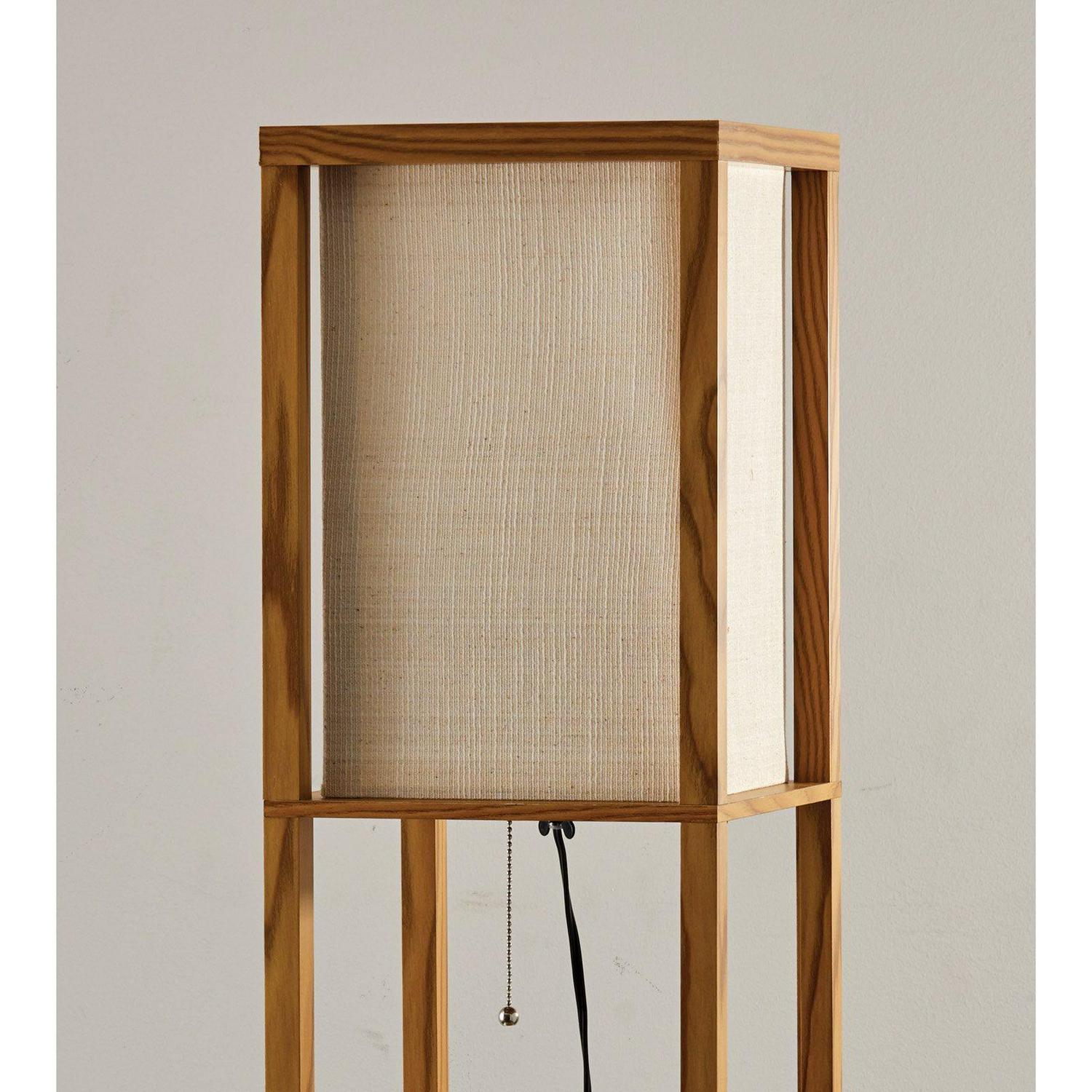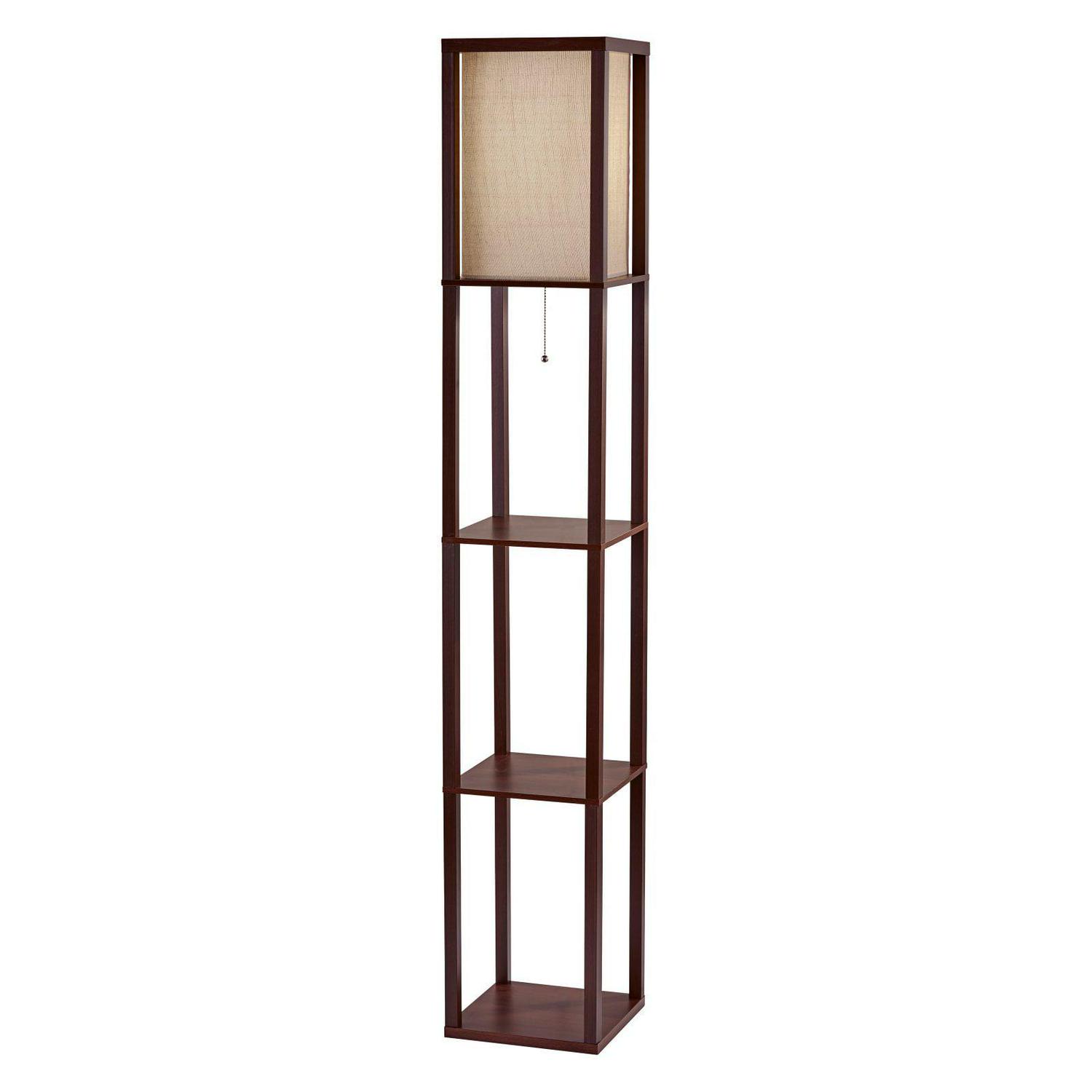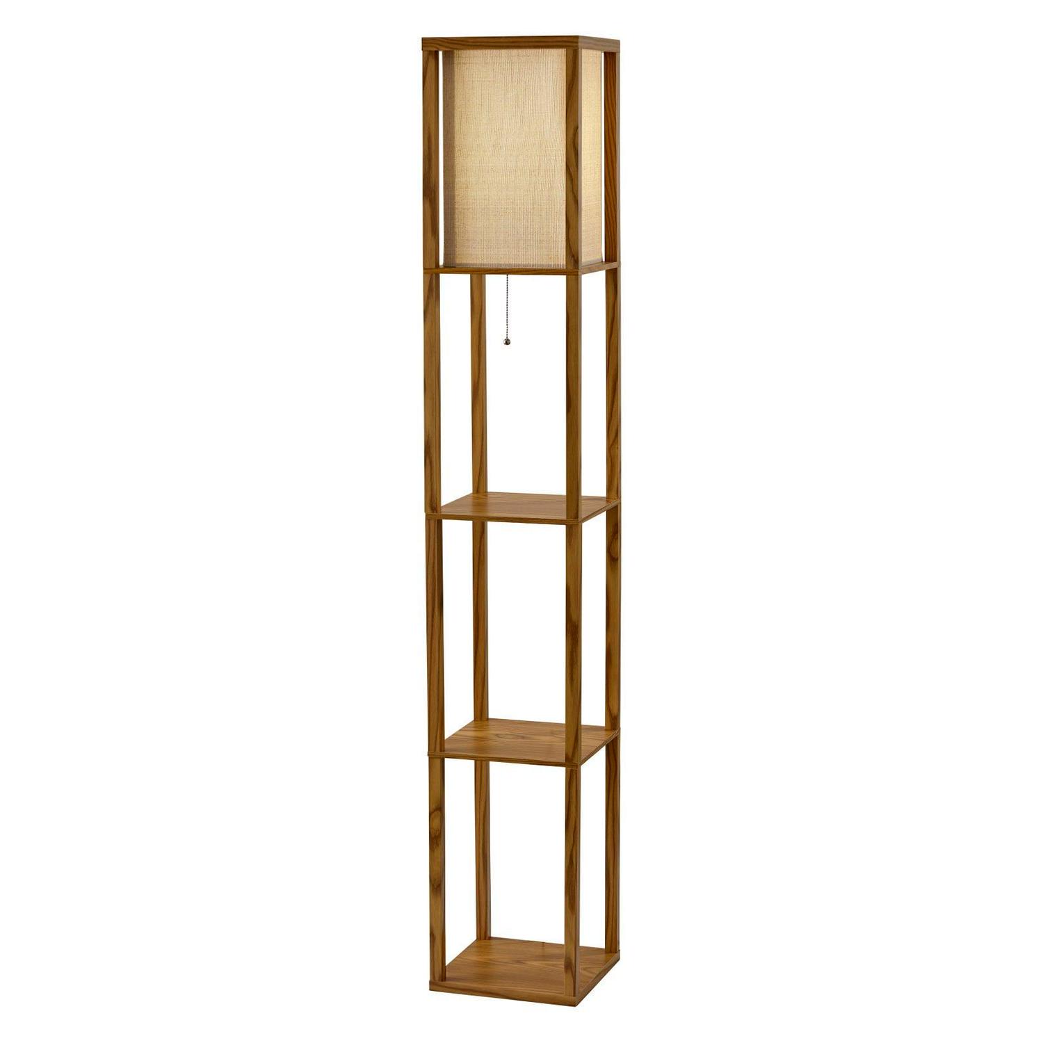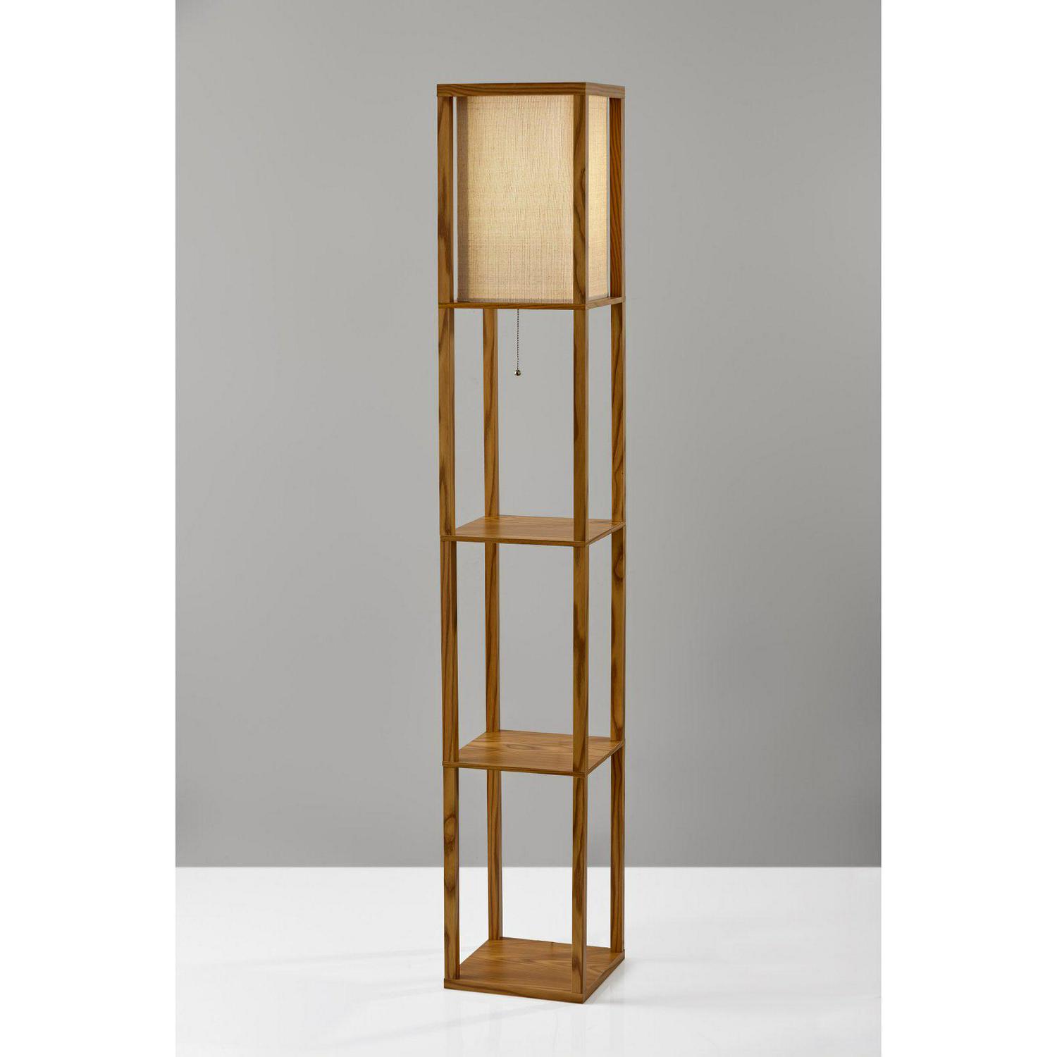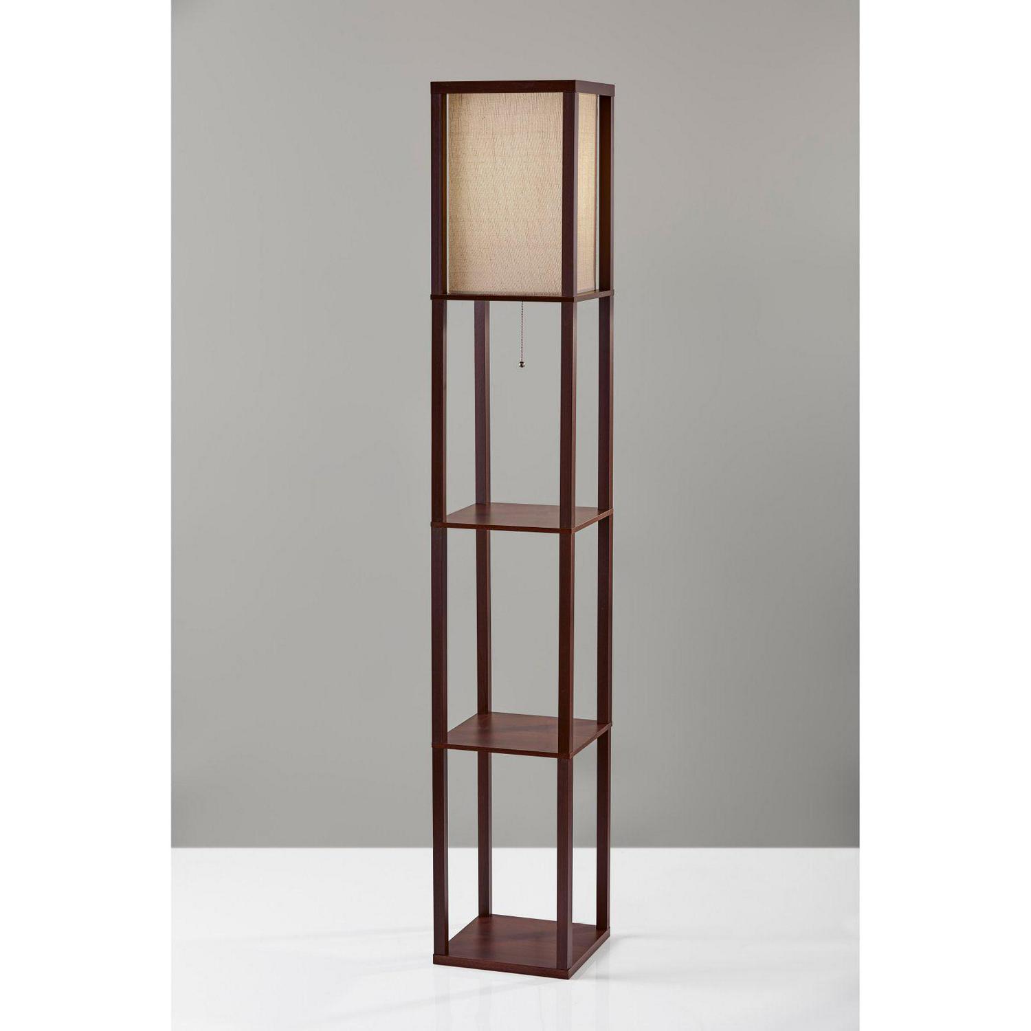 Have it all with style and multi-function. The Wright shelf floor lamp features a walnut wood finished open box frame with two additional display/storage shelves, making it a handy addition to the living/media room, den, office, or bedroom. The square natural textured shade diffuses light from a 150 Watt incandescent or equivalent bulb. The lamp has on/off functionality with a metal ball accented pull chain switch. This lamp has a clear cord and is smart outlet compatible. The lamp comes with clear wire clips for a clean look. Bulb is not included.