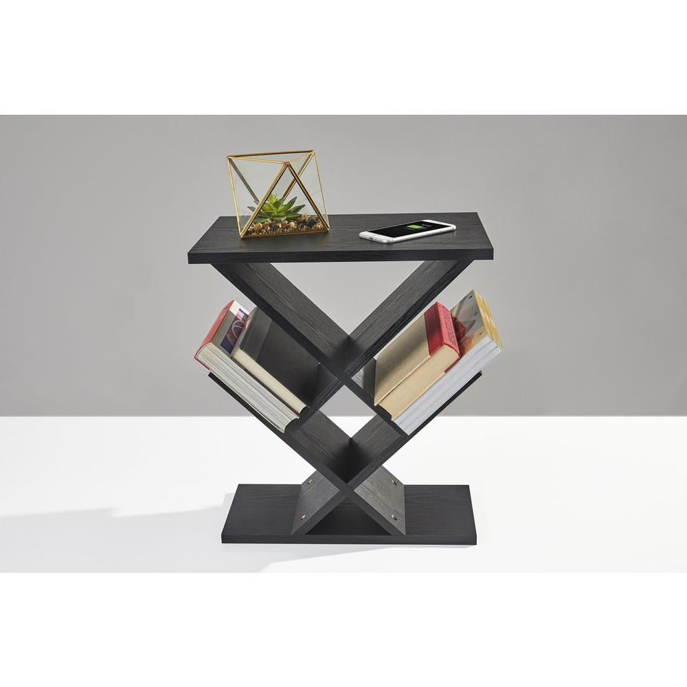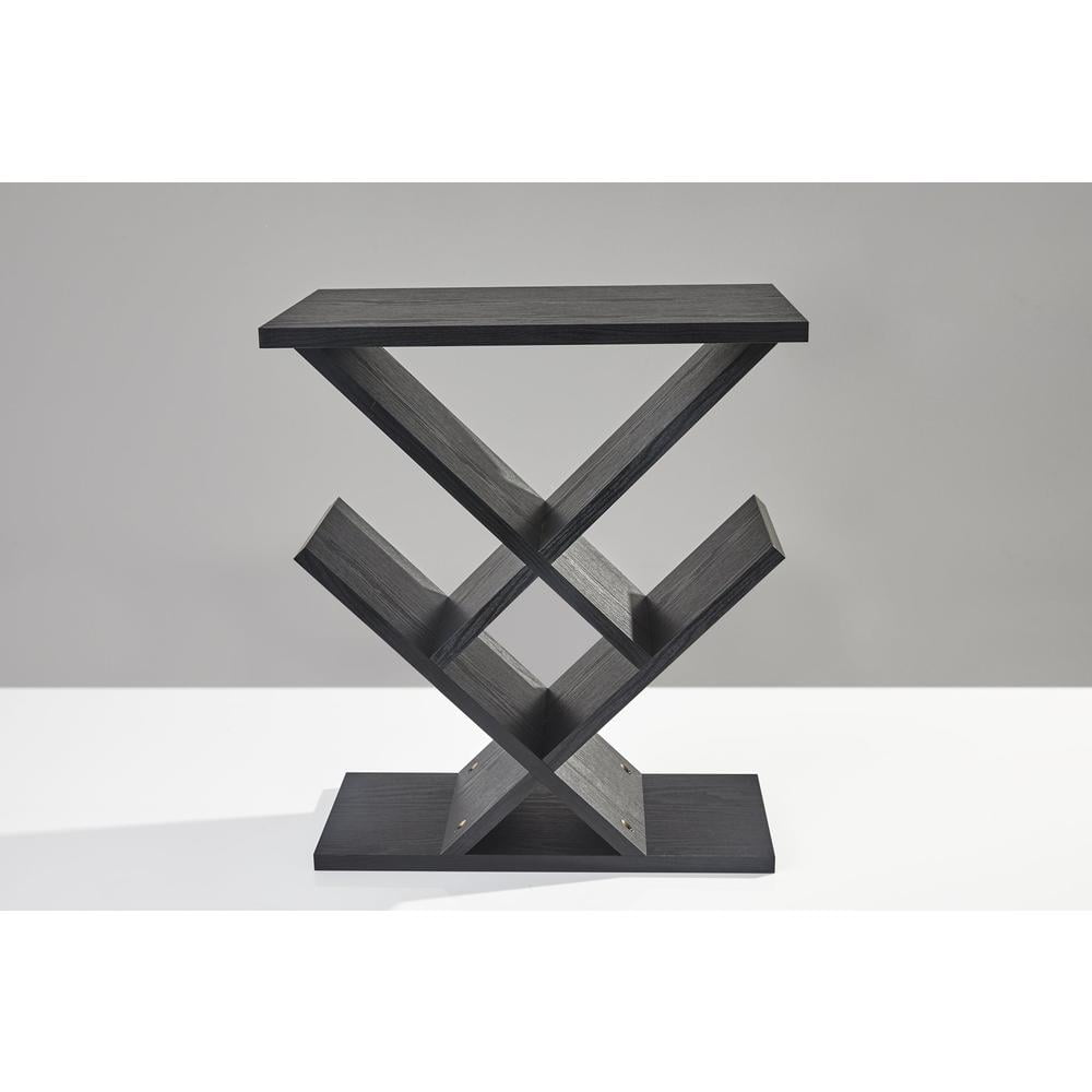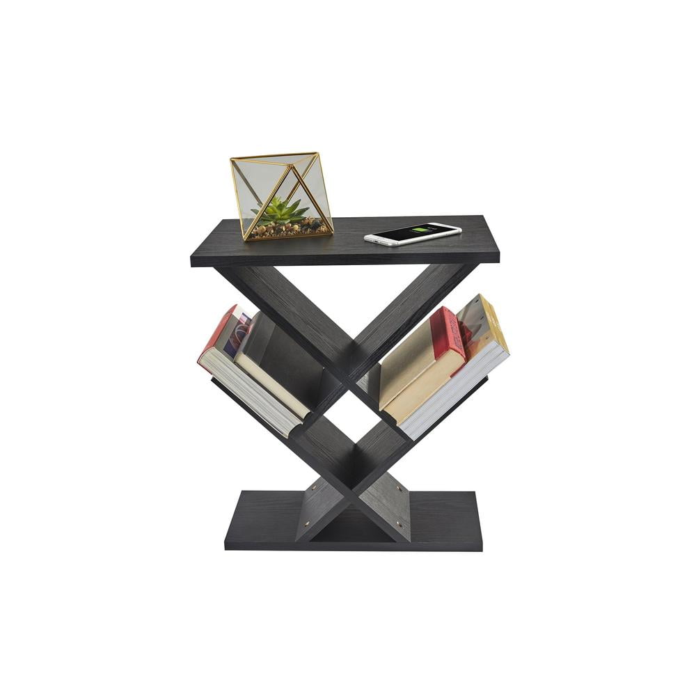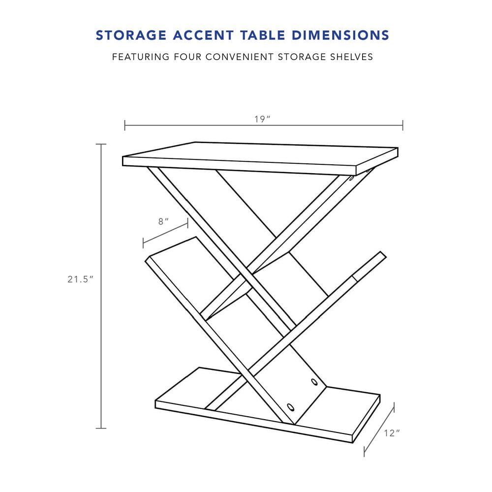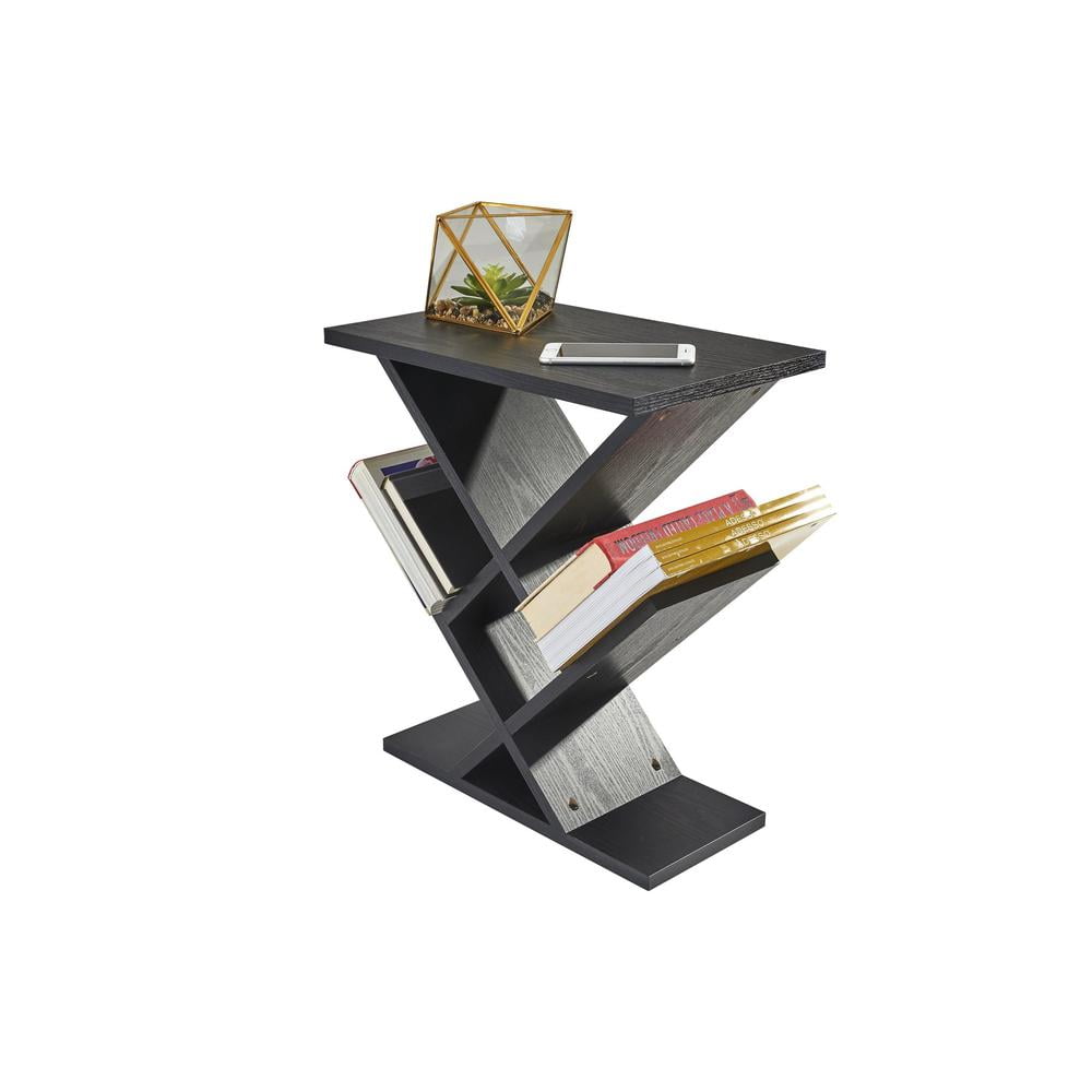 Dimensions: 19W x 12D x 21.5H in. Made of sturdy engineered wood with black wood grain veneer Modern zigzag table with storage and display areas 8-in. deep racks can be used for CD or DVD storage Top display shelf to display items of your choice