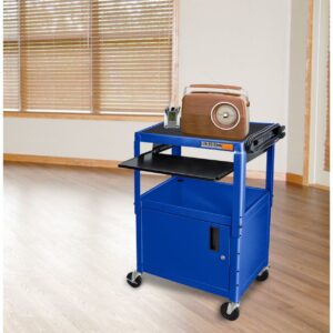 Adjustable Height Blue Metal A/V Cart With Pullout Keyboard Tray And Cabinet Description:Storage, strength and a smart design come together in this utility cart to accommodate a variety of AV needs and users. Features include a retractable keyboard/tablet tray, middle storage shelf and a locking storage cabinet to store equipment. And since the top shelf can be adjusted to heights between 24″ and 42″ in 2″ increments, this cart comfortably suits presenters of varying heights. Full-swivel 4″ casters allow for easy movement and two locking brakes provide stability when you need it. Steel construction ensures the cart is built to last. Locking cabinet made from durable 20-gauge steel featuring reinforced locking doors with full length piano hinges. Rolling cart with four 4″ silent-roll, full-swivel ball bearing casters, two with locking brake.Features:Dimension: 24″W x 18″D x 24″H to 42″H in 2″ increments. Keyboard Tray: 18.75″W x 11.75″D. Cabinet Interior: 24″W x 17.5″D x 16.625″H. Cord: 15′.Easy-access cable cutouts keep the cart clean, organized and safe. .25″ retaining lip borders flat shelves.Roll-formed shelves with powder coat painted finish. Tables are robotically welded for stability.Multipurpose steel utility cart perfect for use with audio/video equipment and more.Assembly required. . Includes safety mat.Brand Name: LuxorModel No: 626-AVJ42KBC-RB