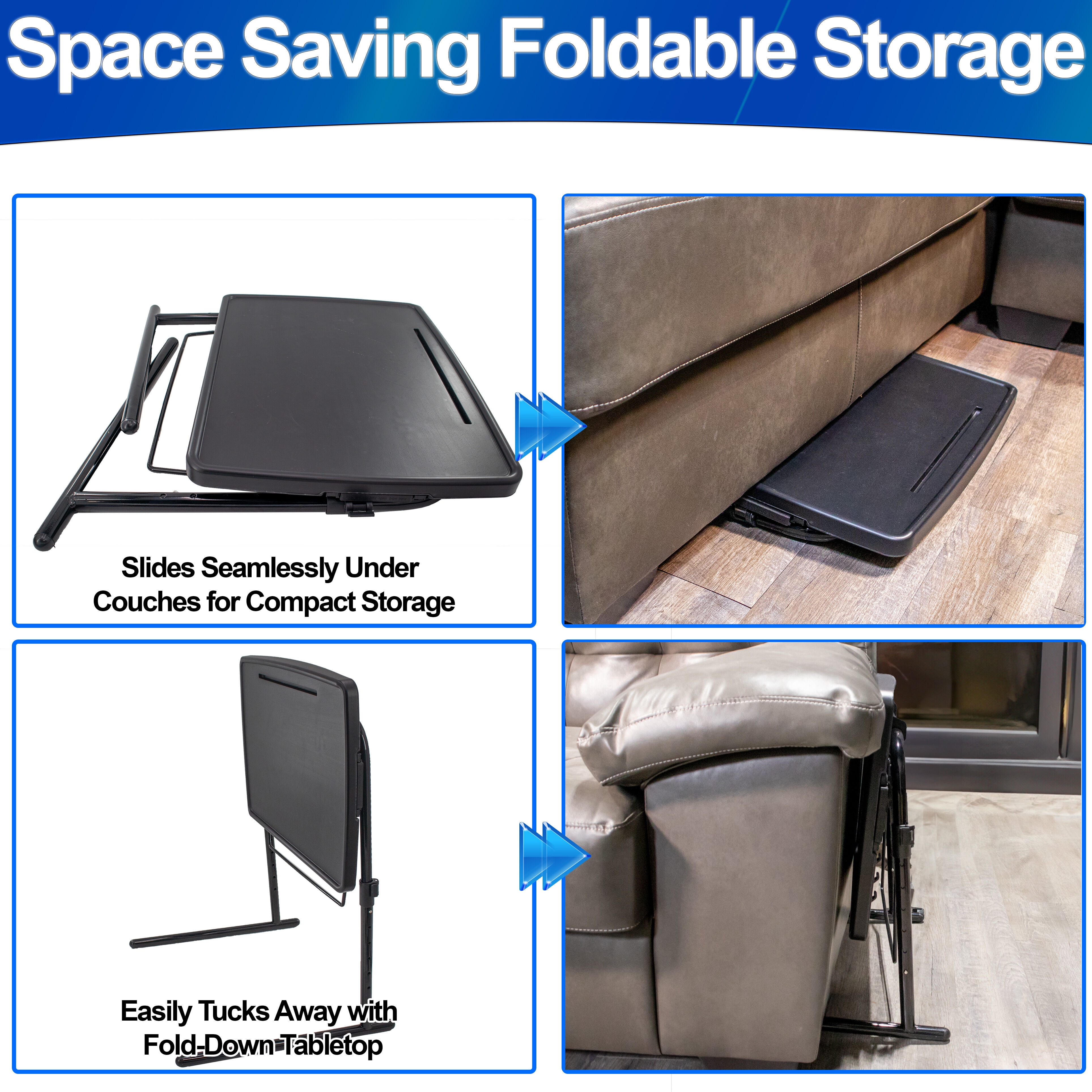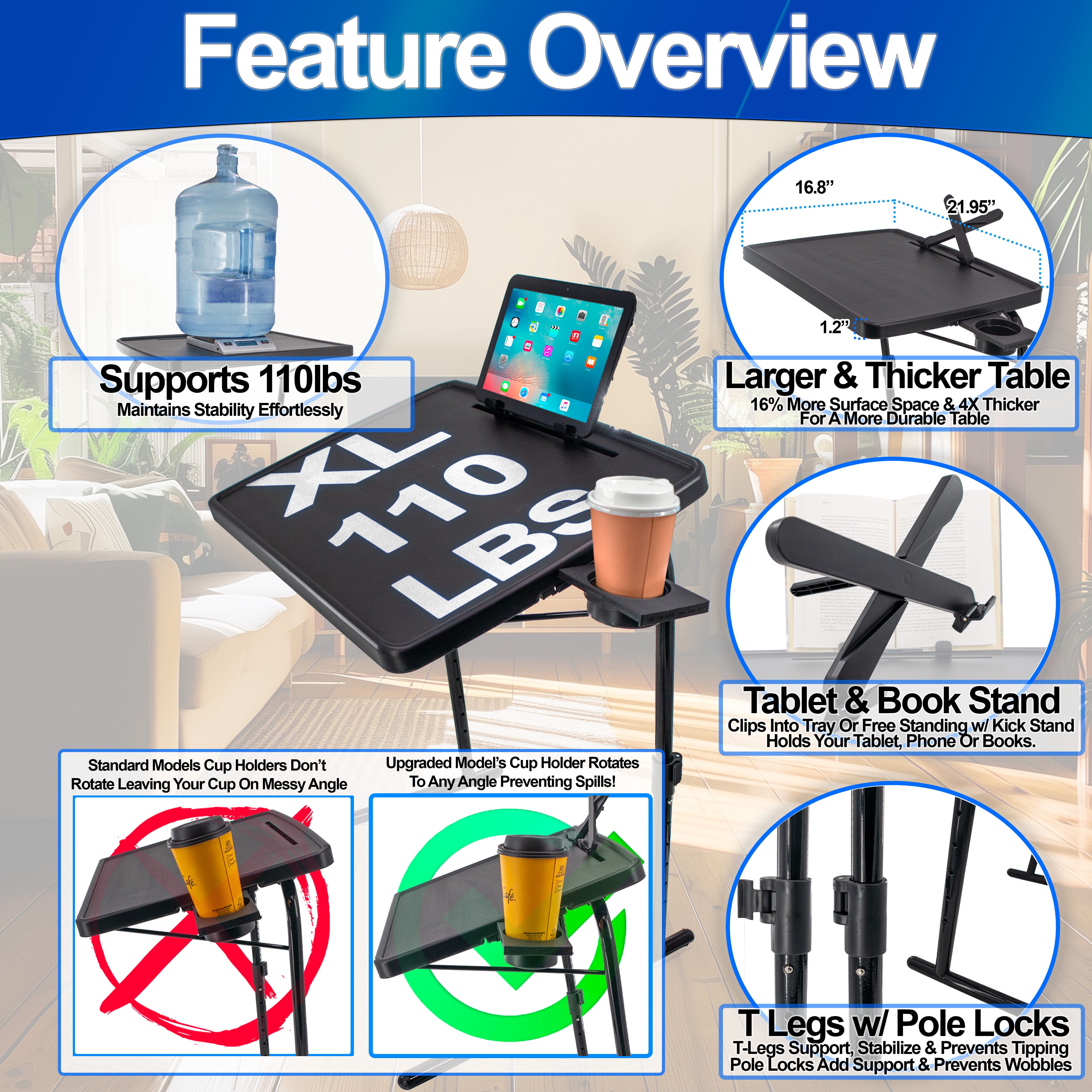 Adjustable and Space-Saving TV Dinner Tray Are you in search of a foldable table that adjusts to your comfort while being easy to move around? Our 5 Star Super Deals TV Tray Table doubles as an ergonomic laptop stand, offering adjustable height settings from 21.7 inches to 29.1 inches and tilt angles from -20° to 20°. The built-in rotatable cup holder ensures your drinks stay upright, preventing spills. With a device slot and book stand, this table isn’t just for TV dinners; it’s a versatile piece you can use for your laptop, reading, or even as a portable workstation in your creative space. Its lightweight and foldable making it an ideal addition to any small apartment or living room. Sturdy and Feature-Rich Portable Table In response to the demand for a dependable surface during everyday tasks, our Portable TV Tray Table is meticulously designed with durability and stability in mind. The foundation, characterized by T-shaped legs and locking mechanisms, effectively counters instability, supporting up to 110lbs with ease. The inclusion of a rotatable cup holder cleverly minimizes the risk of spills, safeguarding your leisure and work sessions. Tailored for the modern multitasker, this table also boasts a handy device slot and an adjustable book stand, enhancing its utility for a wide array of uses. Effortless Assembly and Versatile Use Recognizing the value of your time, our Foldable Tray Table is engineered for simplicity, allowing for a tool-free setup that’s both quick and straightforward. Its collapsible design not only caters to space-efficient storage but also amplifies its versatility. Whether serving as a reliable laptop stand, a cozy reading table, or a convenient crafting spot, this table seamlessly integrates into your daily routine, offering practical solutions to enhance your home environment. With its robust construction, it stands as a trustworthy companion in your day-to-day life, streamlining your activities with unparalleled ease.