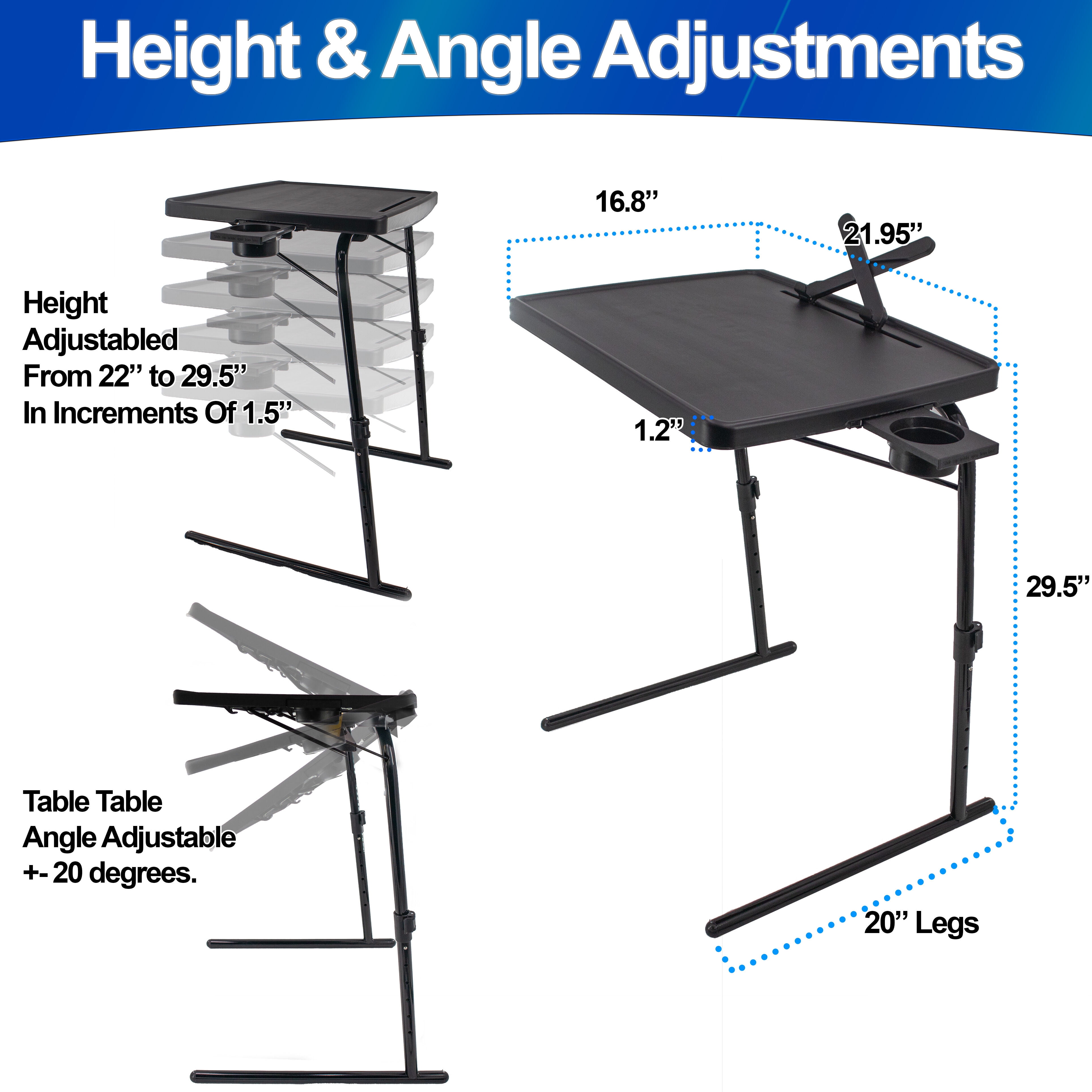 6 ADJUSTABLE TV TRAY HEIGHTS AND TILTS: This TV Tray Table not only features six height settings, ranging from 21.7 inches to 29.1 inches, but also tilts angles from -20° to 20°. Whether sitting on a low sofa, high in the bed, eating, reading, typing, or sketching, it adjusts the table to your preferred height. The adjustable feature provides ergonomic benefits, reducing strain on the back and neck during prolonged use. LARGER TRAY W/ STURDY CONSTRUCTION HOLDS UP TO 110LBS: Crafted with a durable metal frame and a high-grade, durable plastic tray top, this table’s robust construction is designed to support up to 110lbs. Its thicker and larger size provides an expansive 22”×17” surface area, which is 16% more space than standard trays. The tv tray’s thickness is 425% greater, ensuring it can accommodate heavy items. This enhanced durability and size great for those who rely on the table for a variety of tasks throughout the day, from work-related activities that require the placement of multiple electronic devices to leisurely dinners in front of the TV. BUILT-IN ROTATABLE CUP HOLDER PREVENTS SPILLS: This unique tray stand with a sliding cup holder design adjusts with the table’s angle, ensuring your drink stays upright and spill-free under any condition. Particularly beneficial during activities like drawing or using a laptop, where movement could easily knock over a drink. The cup holder makes it perfect for holding various cup sizes, from a morning coffee mug to bottles, making it an essential snack and drink stand. T-SHAPED LEGS FOR ENHANCED STABILITY: The T-shaped leg design not only provides a stable foundation for the table but also ensures ample legroom underneath. This design prevents any obstruction, allowing you to stretch your legs comfortably while using the table for extended periods. Unlike traditional straight or X-shaped legs, the T-shaped configuration ensures the table remains balanced and steady, even when fully extended or when bearing weight up to 110lbs. The table’s solid build ensures it won’t buckle under weight. Whether it’s for drawing, writing, or eating, this table provides the sturdy surface needed for all your activities. LOCKING SUPPORT POLES ELIMINATES THE WOBBLES: The locking support pole mechanism, minimizing wobble and ensuring a steady surface for your activities. Unlike conventional folding tables, these poles lock into place firmly, ensuring the table remains steadfast and secure under various loads. This locking mechanism is designed to counteract wobbling and shaking, which are common in lesser-quality foldable tables. Whether you’re working on a laptop or enjoying a meal, trust in the table’s solid construction to keep everything steady. EASY TOOL-FREE ASSEMBLY: Say goodbye to complicated setups. This table snaps together in seconds without the need for any tools, making assembly a breeze. Simply attach the metal frame to the table top and then unlock the support pole locks, align the pin locks, and slide in the legs. Adjust to the design height you want and lock the support pole locks. It’s that simple, making it an ideal mobile workstation. FULLY COLLAPSIBLE FOR SPACE SAVING STORAGE: Limited space? No problem! Our tv dinner tray table collapses seamlessly, making it perfect for compact storage in tight spaces, from under the couch to inside closets. Its foldable nature allows for compact storage, making the tray table an excellent choice for small apartments, dorms, offices, or that needs to save space. The utility of this table makes it a versatile addition to any side or dining area. LIGHTWEIGHT AND PORTABLE DESIGN: Crafted for mobility, this table is lightweight enough to move from room to room effortlessly. Whether you need a change of scenery or wish to work outdoors, the table’s portability makes it your go-to choice for convenience and flexibility, perfect for eating snacks or as a craft table.