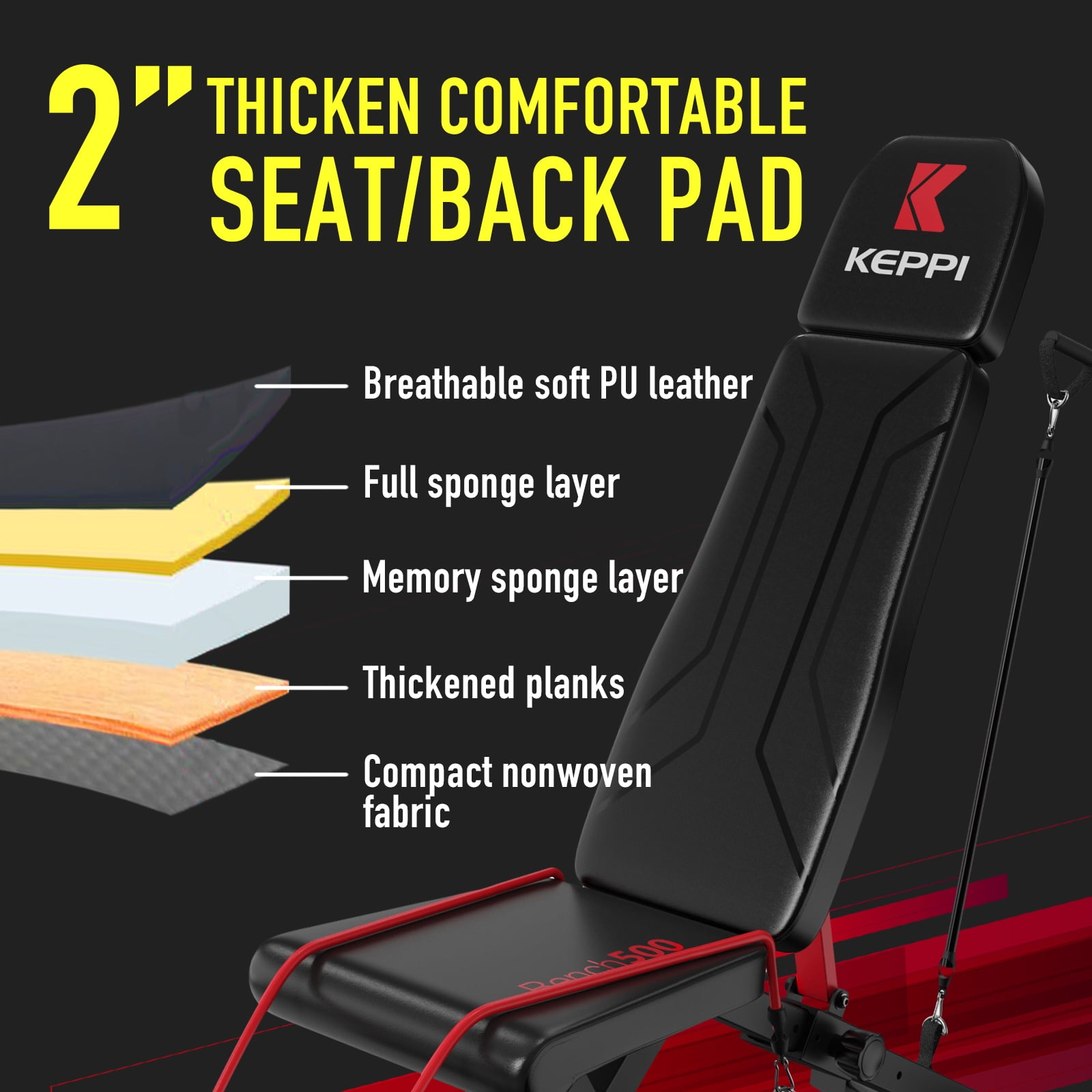 ã”8+4+3″ multi-angle adjustmentã–8 back adjustment & 4 seat adjustment & 3 foot adjustment. To achieve a safe and quick adjustment just pull the adjustment knob to adjust to the right position for you and lock it! ã800LB Load-bearingãMade of heavy-duty commercial thickness steel with a unique triangular frame structure that has been pressure tested thousands of times to ensure the safety of your workout. ãQuality AssuranceãBench500 has been Certified by ASTM and EN20957 – ASTM sets standards for properties and performance in areas such as materials, products, systems and services, and EN20957 is the standards of fitness product quality. ãfolding weight benchãJust pull out the three pins to complete the fold. Save 80% space, you can lean against the wall or put it under the bed when you finish your workout. ãThickened foam padsã All three pads are made of high-quality leather, soft foam wrapped feet to prevent foot injuries when exercising to provide a comfortable and safe exercise experience. ã2 pairs of resistance bandsãWe will provide two pairs of resistance bands as accessories, they will become a good assistant to your fitness. Guarantee – All customers who order will get 2 years warranty for the main frame and 1 year warranty for the interior & padding. We values quality and customer experience and looks forward to providing you with satisfactory products and services!