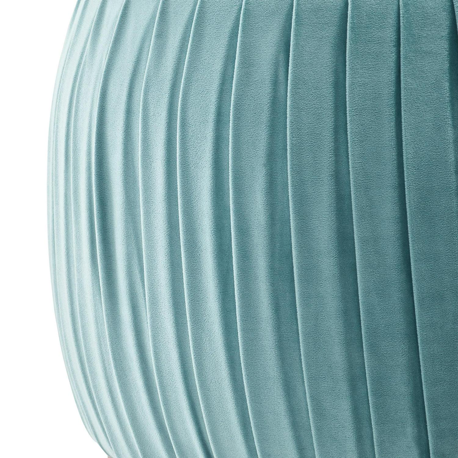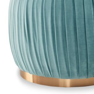 Finish off the look and functionality of any living space with this stylish tufted footrest. A velvet pouf makes the ideal place to put your feet up or set up your tray of favorite snacks. This round ottoman is covered in plush velvet, which is easy to clean and maintain, making it perfect in rooms that see many guests or areas with pets. Add an air of elegance to your living room, bedroom, or home office with the pleated fabric and shining gold base of this ottoman. Its compact size makes it perfect for any room, especially small living spaces that can use a little pop of color or a chic accent piece. Adore Decor Jolie Round Velvet Ottoman with Pleated Upholstery, Seaglass Teal