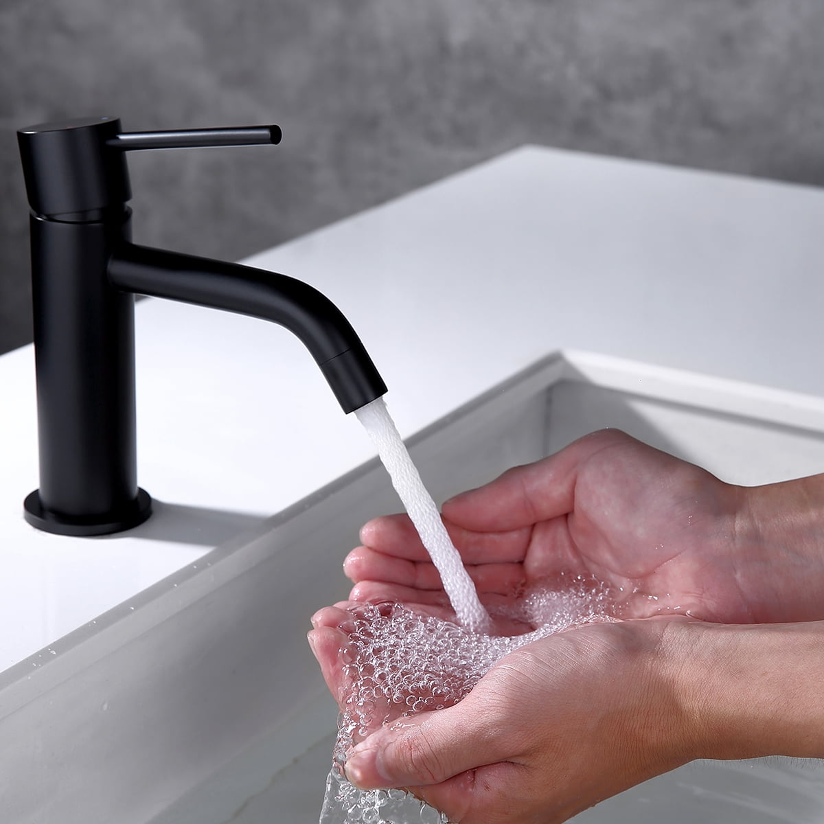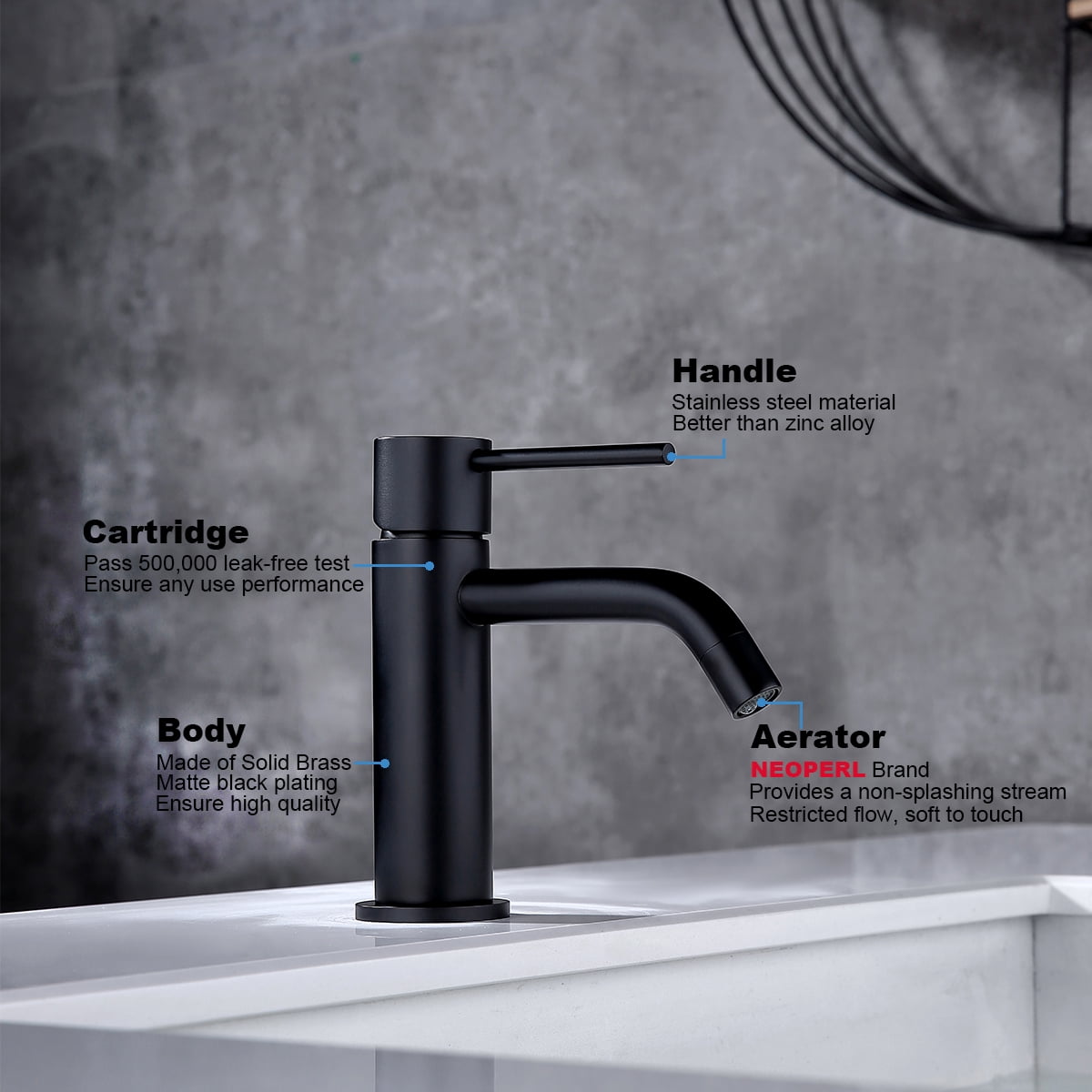 Matte Black Single Hole Bathroom Faucet —– We focus on making great products that enhance your bathroom experience. Our bathroom faucet is made of solid brass. The spout height is 2.6 inches. The spout range is 4.8 inches. The installation method is Deck Mounted. Bathroom Faucet, Pop-up drain, Supply Lines and Installation Instruction in the box.