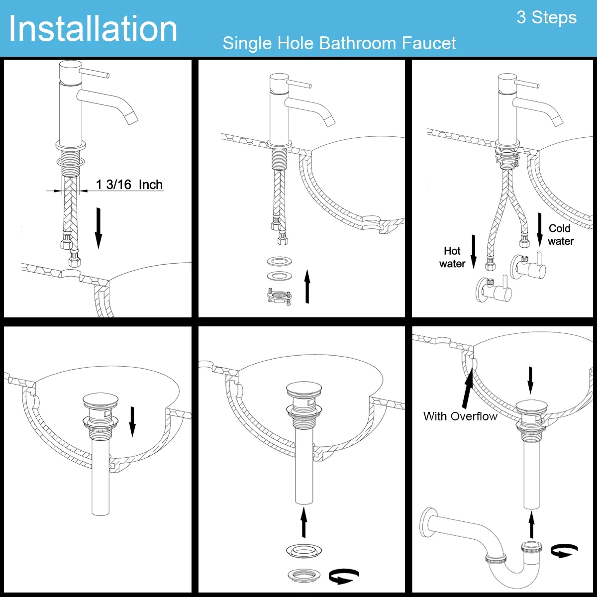 【EXCELLENT USER EXPERIENCE】-Single Hole Brass Matte Black Bathroom Faucet with Pop Up Drain Assembly. 【LEAK-FREE STRUCTURE】-Single handle basin faucet is made of brass construction for maximum durability and also with premium ceramic cartridge longevity guarantee. 【1 HOLE DESIGN】-NO Deck Plated, single hole vessel bathroom faucet is designed to fit 1 hole configurations, require hole size: 1.18-1.38 in / 30-35mm, max counter top thickness without deck plate: 1.38 in/ 35 mm 【HOSE INCLUDED】-Comes with Hot & Cold Water Hoses for stop valves connecting. (Length: 23.6 inch /600mm, Thread: 9/16-24 UNEF standard) 【DESIGN】-American style push pop-up drain assembly fit bathroom vanity sink with minimum drain hole diameter of 1-5/8” easy to install in standard sized plumbing 【EASY TO OPERATE】-Single handle design for precise & effortless control of cold & hot water. Flow rate: 1.2 GPM. CEC listed. Installation Step Slide single hole faucet through the sink mounting hole, please check the hole size for the installation. Min 1-3/16 inch. Place stainless steel washer and rubber washer onto mounting studs under the sink, and tighten the nuts securely as shown. Remember use the screwdriver to tighten the screws which in the nuts both side. Connect and tighten the HOT and COLD supply hose to the valve and check any leakage before use.
