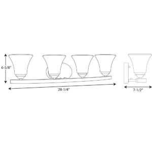 Adorn features a sweeping arced frame that supports elegant, tapered glass shades. This four-light bath fixture is finished in Antique Bronze with etched glass. It can be installed with shades facing either up or downwards. Adorn coordinates great with the Joy and Bravo families.