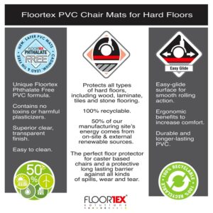 Cleartex Advantagemat chair mats provides a high quality and durable solution for floor protection and ergonomics. Protects your hard floor surfaces from office chair casters, general wear, scuffs and spills. Will not crack, chip, break or shatter under normal use and correct application. Free of phthalates, tin, lead, cadmium and BPA for peace of mind when used around children or pets. Eco-friendly manufacturing with 50% of our manufacturing site s energy coming from on-site and external renewable sources. Contains up to 25% recycled content. 100% recyclable. Limited Lifetime Warranty.