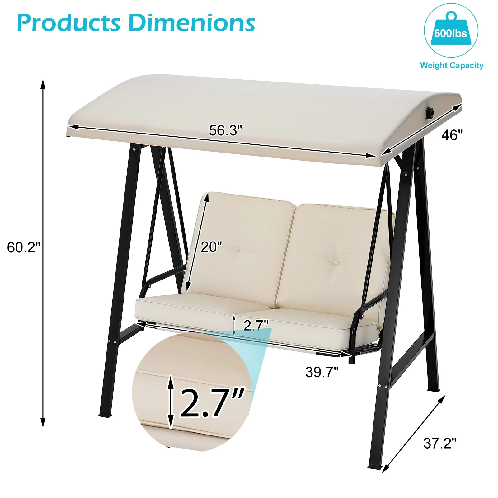 Stable Structure & Strong Spring Hook: The porch swing has a triangular frame with powder-coated finish and premium springs connect the swing to the frame in a safe position when swinging back and forth. Dual Purpose Canopy: The canopy of this yard swing can be adjusted with a adjustable knob to adapt to strong sunlight in different directions, which can protect you from harmful UV rays. When night falls, the canopy can be used as an outdoor projector screen, giving you and your friends or family a visual feast. Thickened Cushions & Dimension: The patio swing has a spacious space with soft and flexible thick backrest and cushions, which will bring you a more comfortable sitting experience. Available in All Seasons: 180g Polyester seat without cushions for extra breathability when sit in spring and summer; the 2.7-inch thick cushion brings warmth and comfort in the autumn and winter. Cozy Swing Chair: The 2-person seat of this canopy swing is designed to allow you and your family or friends to get closer with each other, talk more deeply and have a more intimate relationship. Specification: Material: Steel & Polyester Fabric Weight Capacity: 600 lbs Cushion Thick: 2.7-inch Overall Dimension: 56.3”(W) x 37.2” (D) x 60.2”(H)