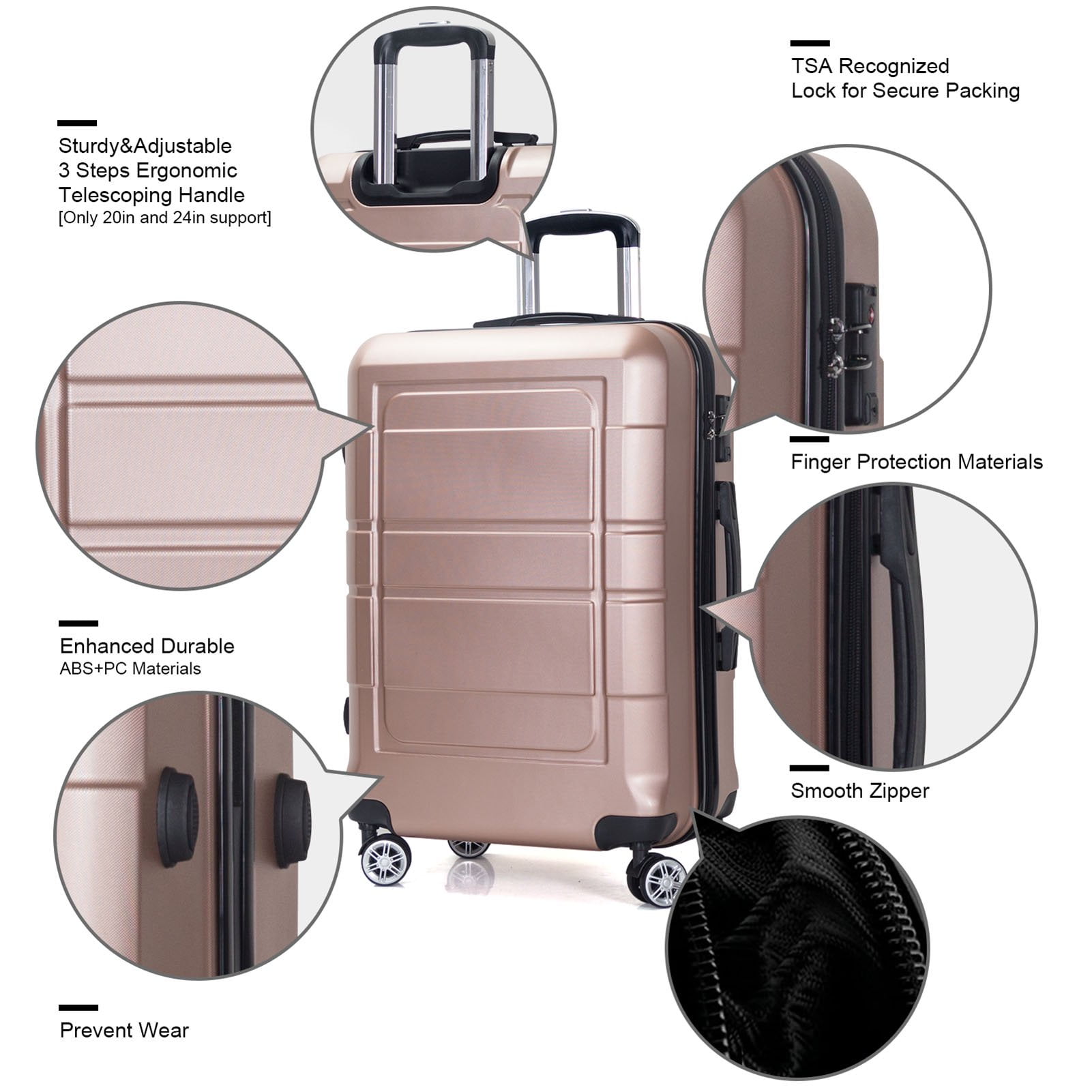 LIGHTWEIGHT AND DURABLE: This travel bag has lightweight ABS and PC printed film engineered material and manufactured with a micro diamond finish. Its front and back shells are scratch and water resistant. DELUX INTERIOR: This 20 inch carry on luggage bag organizer has smooth gliding self repairable oversized zippers and tie-down straps on the other side for easy packing. SPINNER WHEEL: This spinner luggage has four spinner wheels with 360-degree multi-directional mobility that keeps weight off your arm. It has four side studs allows the luggage to stand upright on their side. ERGONOMIC HANDLE: This rolling suitcase has top and sides ergonomic GEL handles for comfortable and easy lifting when checking baggage. This suitcase is the perfect choice for business and family trips. TROLLEY SYSTEM: This travel rolling suitcase has push-button locking handles that can easily be extended out from the suitcase and store neatly inside. TSA approved combination lock to ensure the security.