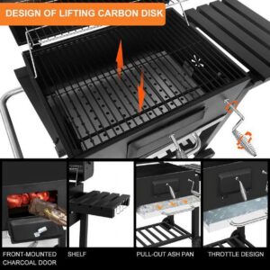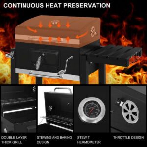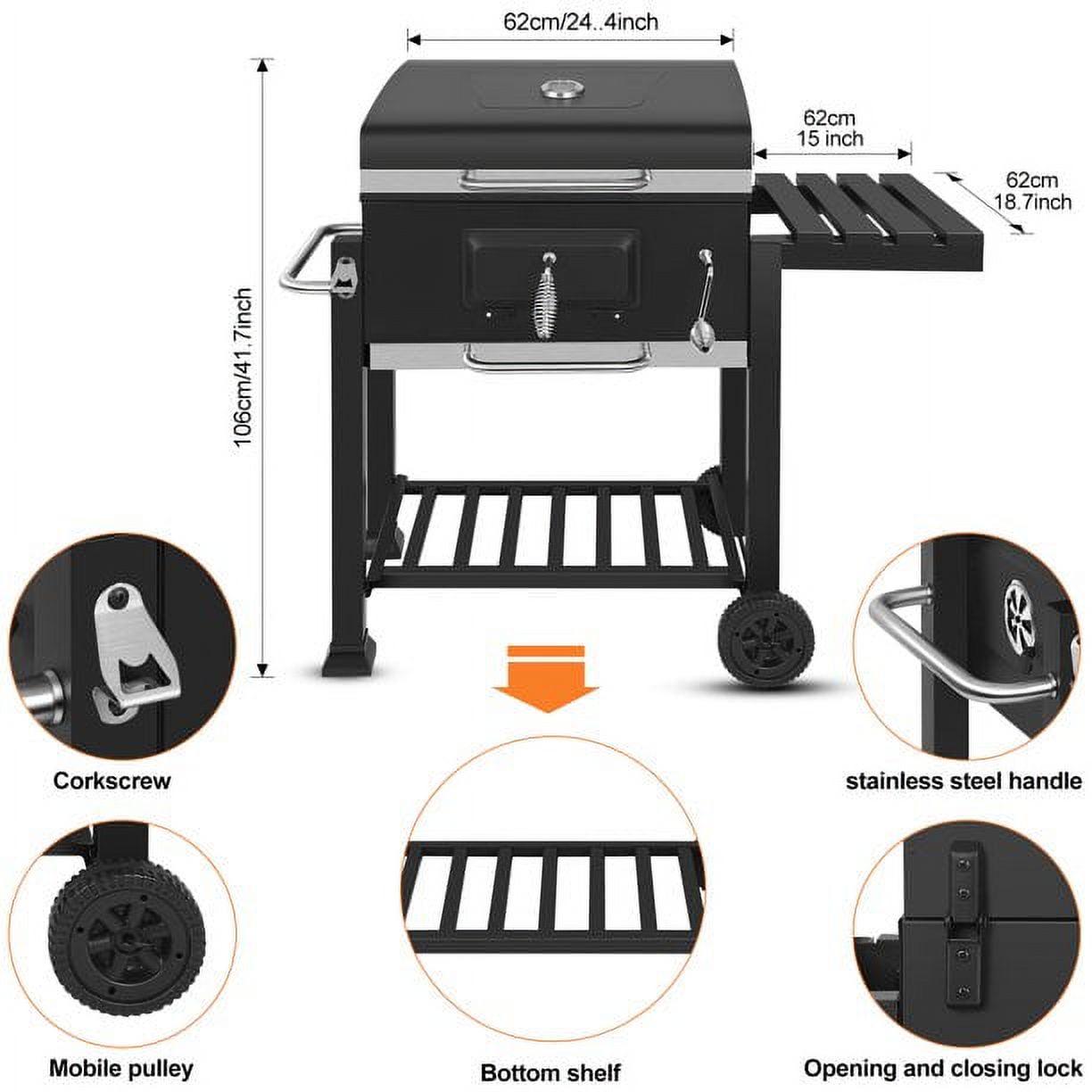 – Easy to add coal and clean ashes: through the front charcoal access door, you can quickly add coal during the barbecue. The galvanized ash tray collects ashes for easy dumping.