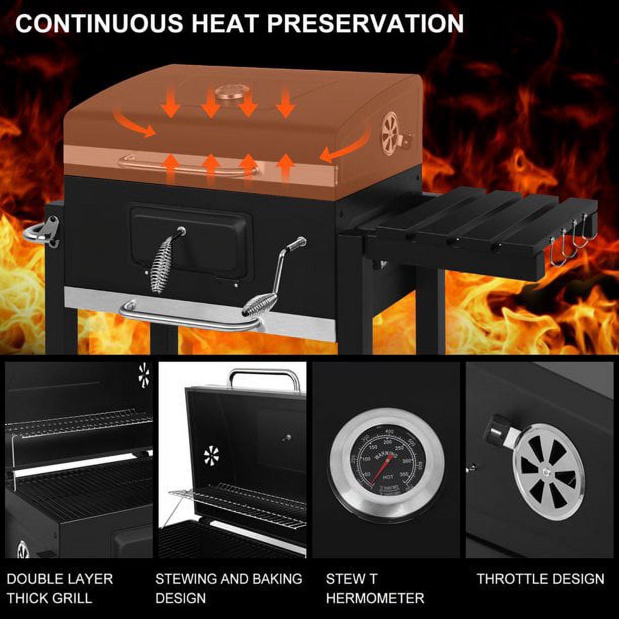 – Large Grilling Space: A total of 403.5 sq. inches grilling space, 106 sq. inches stainless-steel warming rack for the perfect smoking experience and could grill food for more than 8 people at one time.