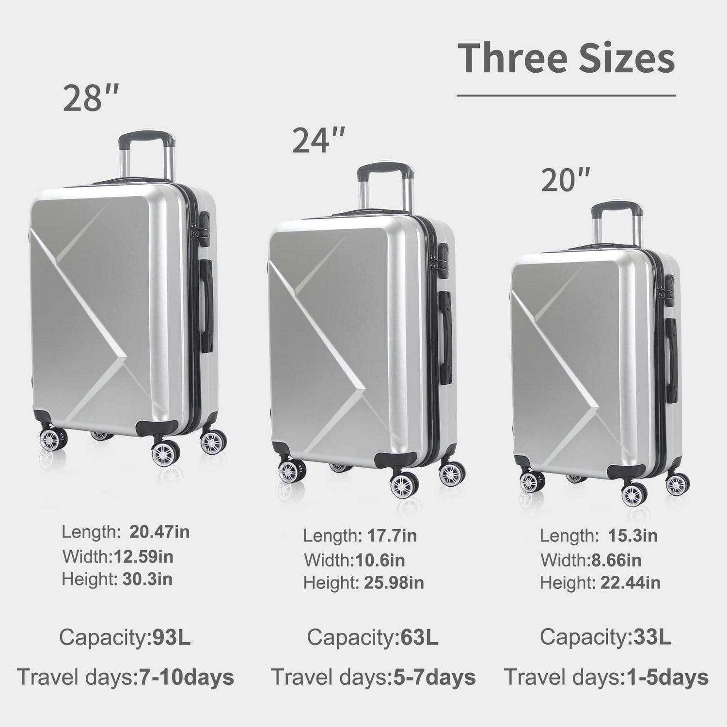 – 3 Piece Set Size: 20 inch Carry On (meets carry on size restrictions for those traveling domestically and looking to stay light) ,24 inch and 28 inch LUGGAGE (maximize your packing power and the ideal checked bag for longer trips).
