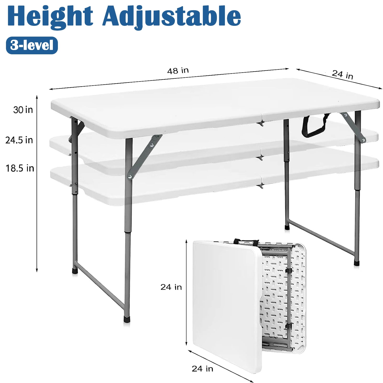 Heavy-duty Table Top: Place food, drinks, and much more on the strong, easy-to-clean tabletop with high-quality plastic up to 17% thicker than other brands, plus 3x the weight capacity at 300 lbs. Indoor/Outdoor Use: Versatile use makes it perfect as a dining or game table for outdoor cookouts or birthday parties, or as a serving or display table for indoor events. Support: Powder-coated steel legs, frame joint locks, and non-slip rubber feet help to keep the table in place during every event. Portable: Foldable design includes a side lock and handles, making it easy to take on the go or store away in a compact space when not in use. Overall Dimensions: 48″ (L) x 30″ (W) x 24″ (H)