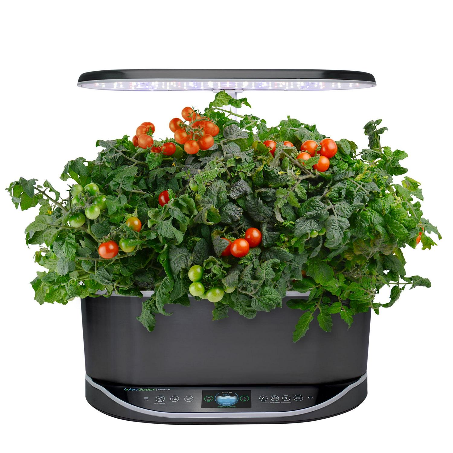 Want garden fresh tomatoes in the middle of winter How about beautiful petunias for months on end with no florists fee Meet the AeroGarden Bounty Elite, a sleek, stainless steel indoor garden that allows you to grow up to 9 different herbs, veggies, or flower varieties up to 24″ high. The Bounty Elite’s water bowl is the same large bowl as the AeroGarden Bounty, letting you go longer between fill ups. The 50W LED grow light promotes rapid plant growth, and can be adjusted to whatever light intensity you’d like with just a slide of your finger. The full color, high-resolution touchscreen control panel displays all your garden’s vital statistics (water level, days planted, plant types) and gives you reminders for when to add things like water and plant food. Throw in the WiFi and Alexa compatibility and vacation mode and you’ve got one of the most advanced and responsive indoor gardens ever. So, why wait for the perfect weather Make everyday a great gardening day with the AeroGarden Bounty Elite indoor garden.