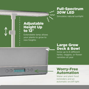 – Adjusts for up to 12 of grow height, has a sleek, stainless-steel finish, and is only 4.5 wide making it a great fit for limited counter space